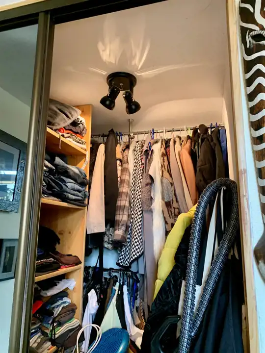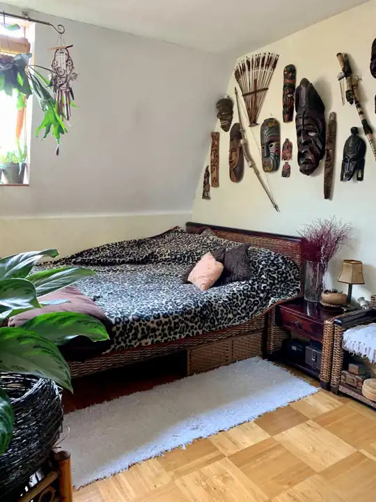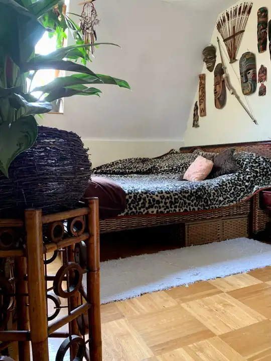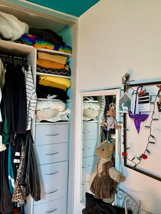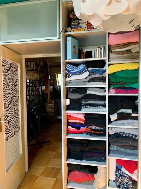 W jednej z sypialni duża, pojemna szafa z pawlaczami, drążkami i półkami.