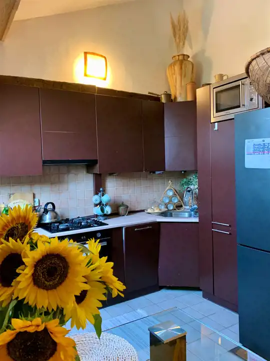 W kuchni zabudowa meblowa e sprzętem AGD.