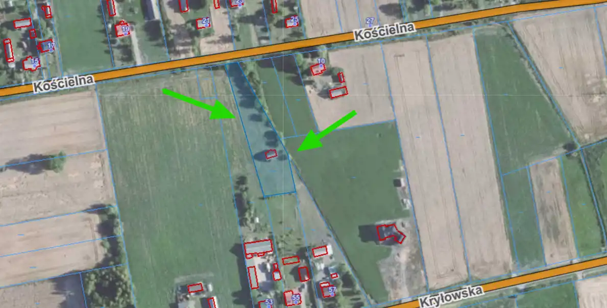 brak mediów na działce, możliwość włączenia się do sieci (wodnej, kanalizacyjnej i elektrycznej) znajdującej się w pasie drogowym ulicy Kościelnej