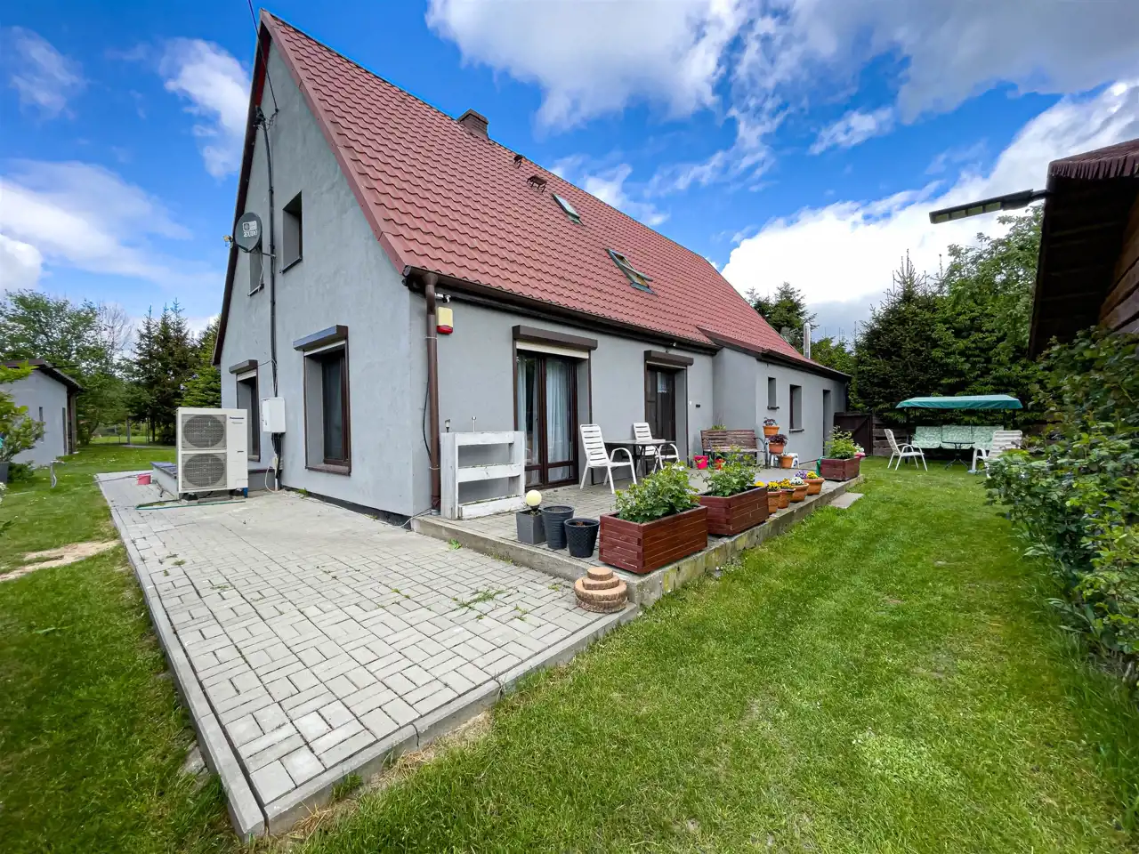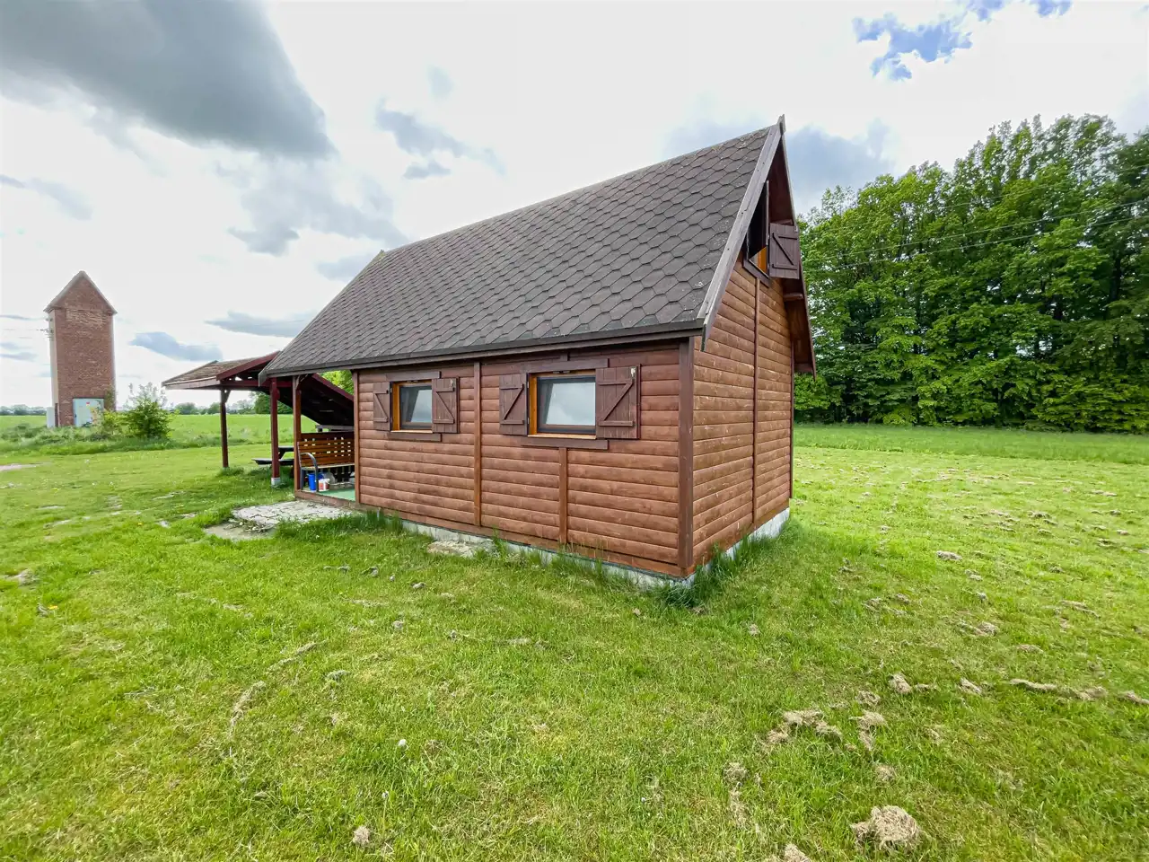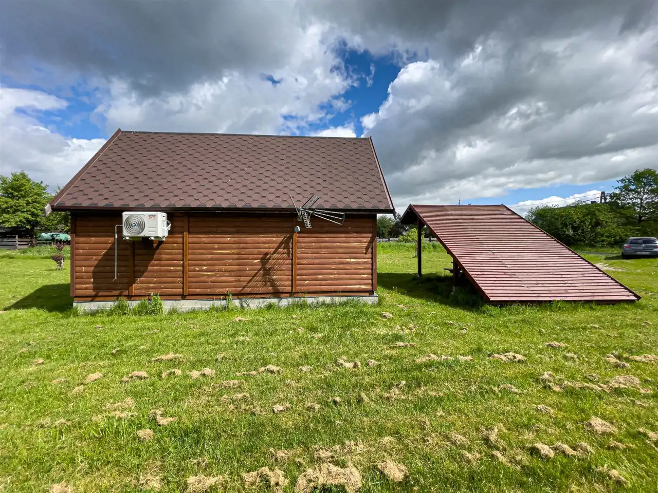 Na działce rolnej posadowiony został domek drewniany (całoroczny), z klimatyzacją z funkcją grzania w pełni wyposażony idealny pod wynajem również długoterminowy, przy budynku wiata.