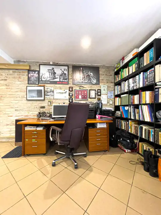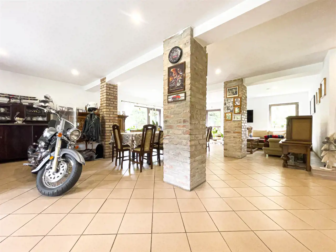 Budynek gospodarczy o pow. 240 m2 z wygospodarowaną częścią pod garaż (dwu a nawet czterostanowiskowy). W budynku gospodarczym zamontowany agregat prądotwórczy o mocy 16 kw wpięty w sieć zasilający w razie konieczności całą instalację domu.