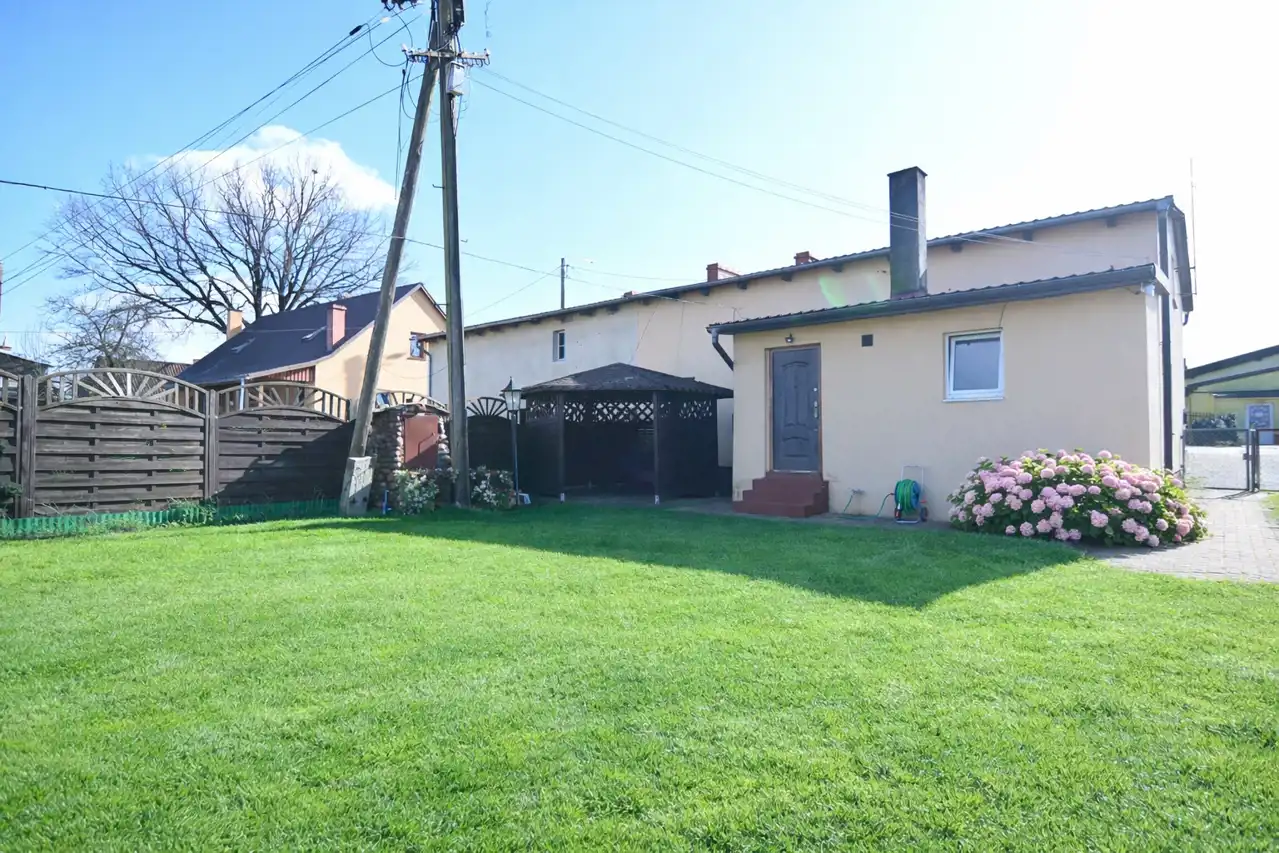 Na zagospodarowanej działce znajduje się garaż z kanałem, kilka pomieszczeń gospodarczych, wiata wypoczynkowa, miejsce na ognisko oraz drewniany podest do basenu. Teren jest w całości ogrodzony, a wjazd na posesję prowadzi przez solidną metalową bramę.