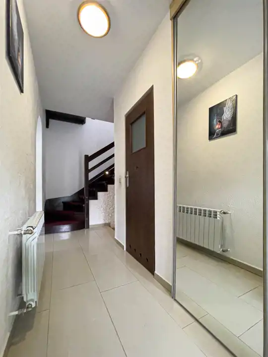 Drewniana stolarka okienna wraz z roletami przeciwwłamaniowymi sterowanymi elektrycznie, dach dwuspadowy, połać dachowa pokryta dachówką ceramiczną. Rozprowadzona instalacja pod system alarmowy. Cały budynek ocieplony styropianem o grubości 18 cm, ogrzewanie kocioł na węgiel/drewno wraz z zasobnikiem ciepłej wody użytkowej, parter ogrzewanie podłogowe na poddaszu zainstalowane grzejniki.