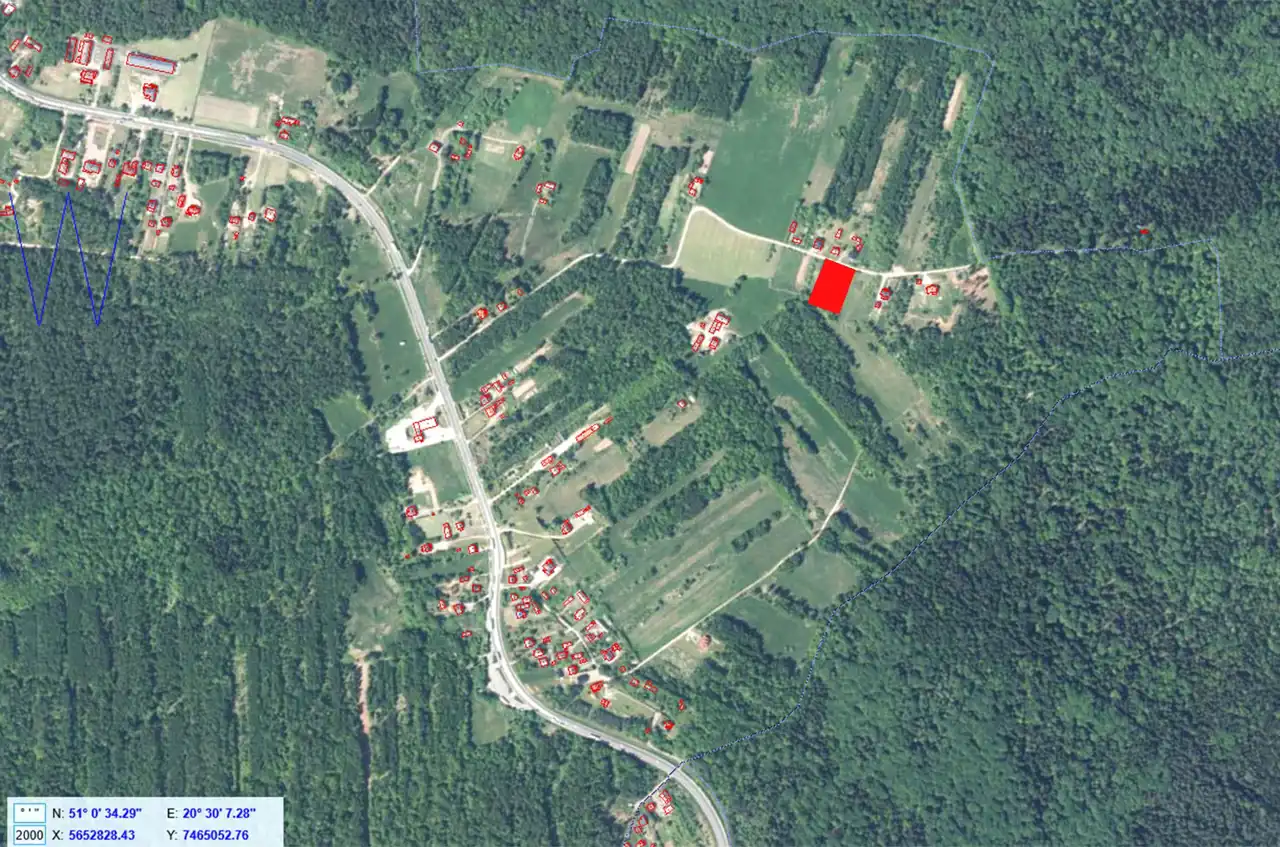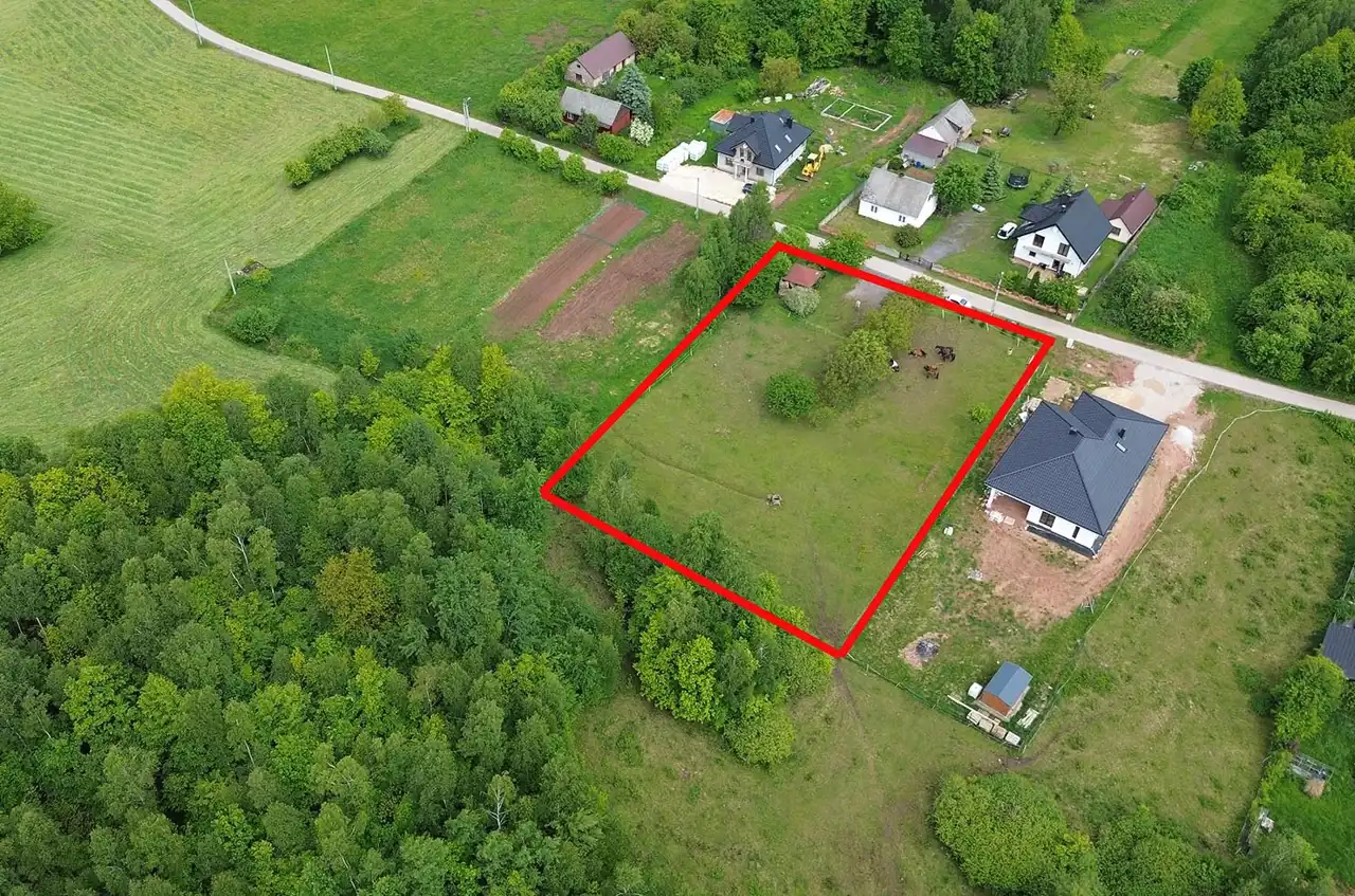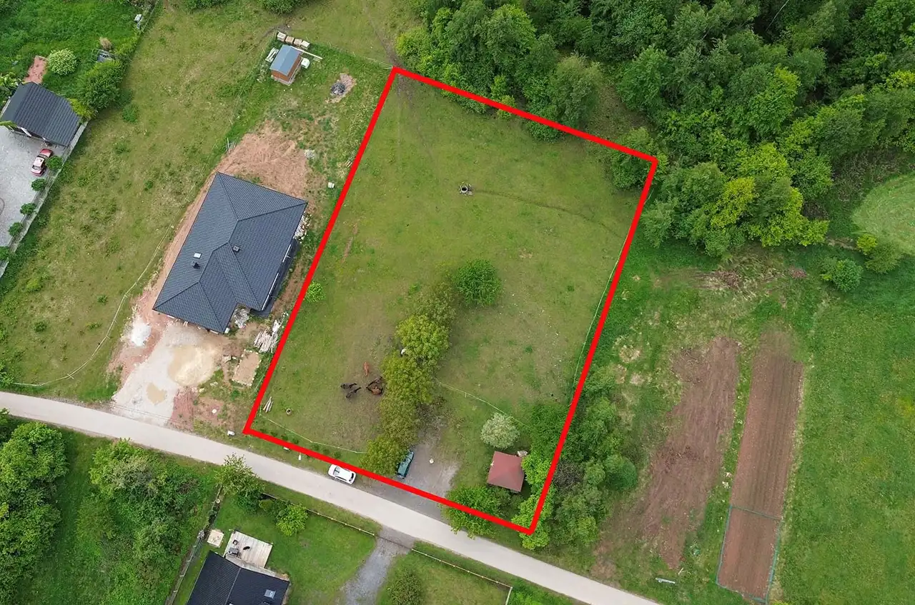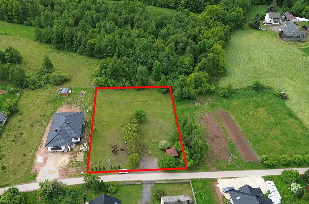 For sale: attractive plot of land with an area of 3029 m², located in the village of Mniów, Mniów commune. The plot is rectangular in shape, with a wide frontage (approx. 45 m). Situated in the first building line, directly by a municipal asphalt road. The land is undeveloped and unfenced. The surrounding area features single-family housing, greenery, peace, and quiet. Convenient access – 25 minutes from Kielce (19 km).