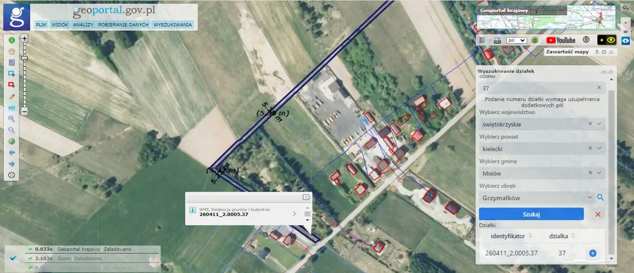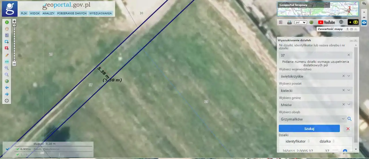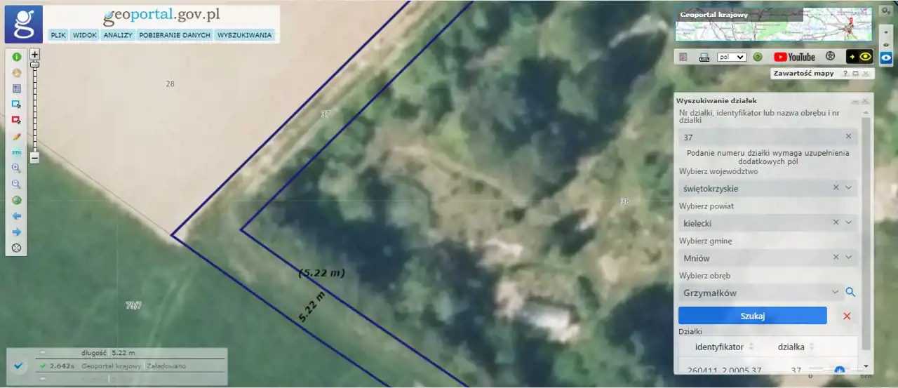 For sale: a plot of land with an area of 21,600 m², located in Grzymałków, Mniów municipality. The plot is flat, in the second line from the asphalt road, undeveloped, and trapezoidal in shape.