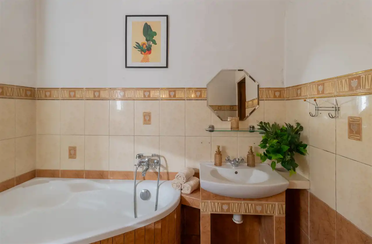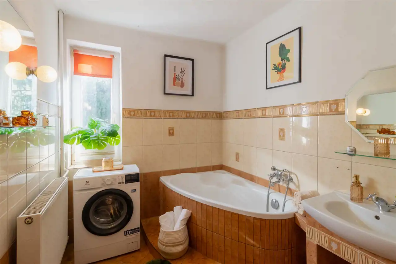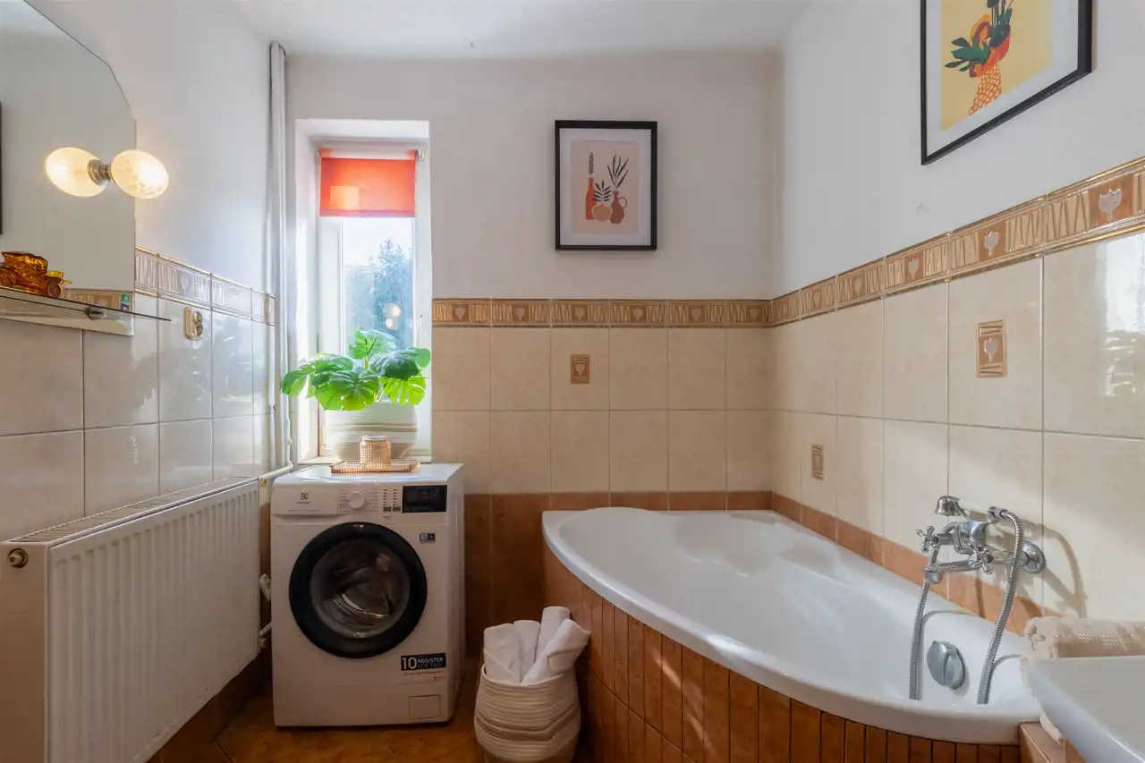 Łazienka: wanna, umywalka, pralka.