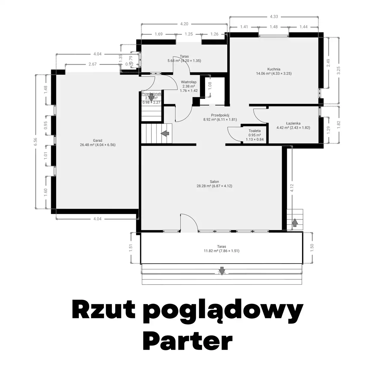 Strefę dzienną: kuchnię, salon z wyjściem na taras, łazienkę z wanną, toaletę, hol, wiatrołap, którym również przejdziemy do piwnicy i garażu.