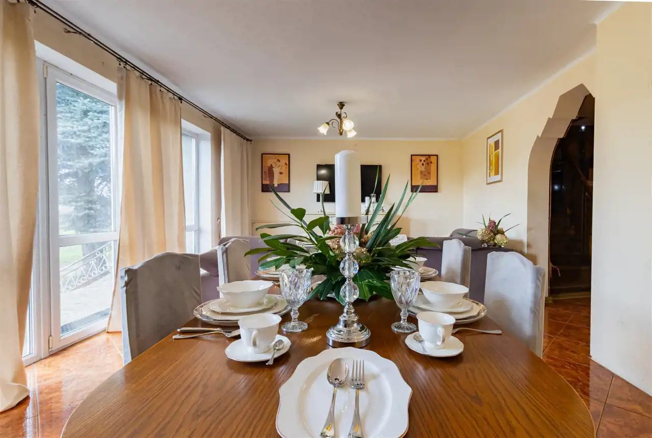 - Oryginalność tej nieruchomości jest zauważalna na pierwszy rzut oka, z salonu wychodzi się na taras z szerokimi, reprezentacyjnymi schodami prowadzącymi wprost do ogrodu - to nieoceniona przestrzeń, która staje się naturalnym przedłużeniem domu.