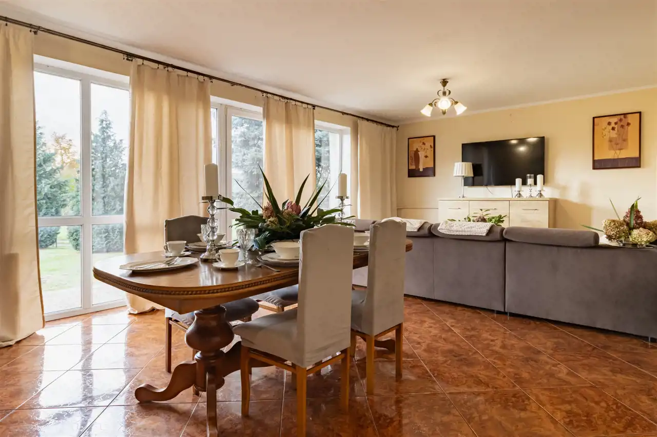 Salon: komody 2 szt., stolik, kanapa, stół, krzesła.