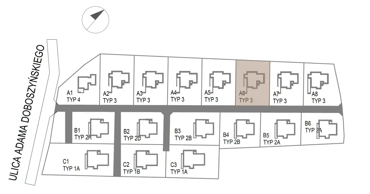 Miejsca postojowe dla gości i kurierów przed wjazdem; dodatkowe, przypisane miejsca postojowe wzdłuż ulicy dla poszczególnych willi.