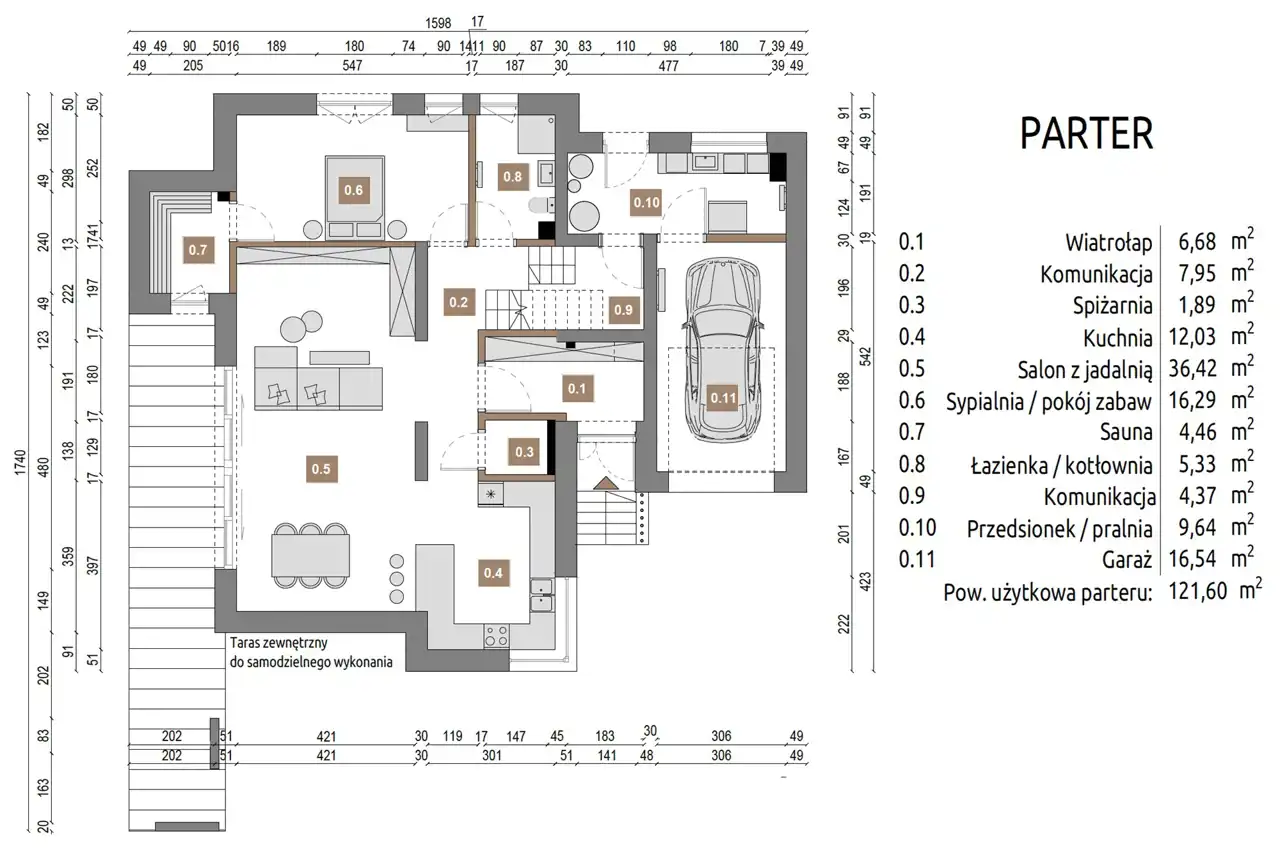 Garaż wbudowany z instalacją elektryczną i wodną; brama segmentowa na pilota.