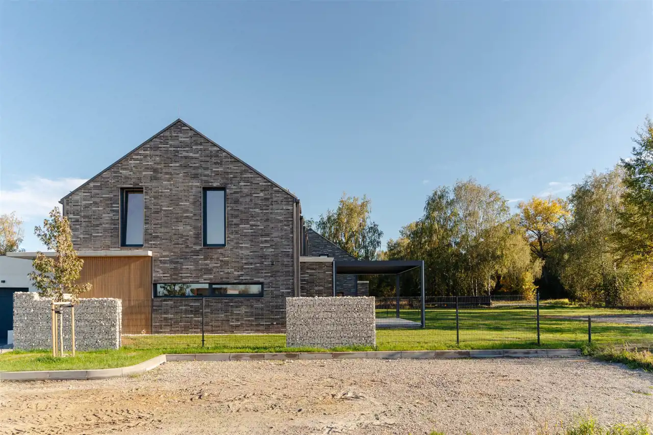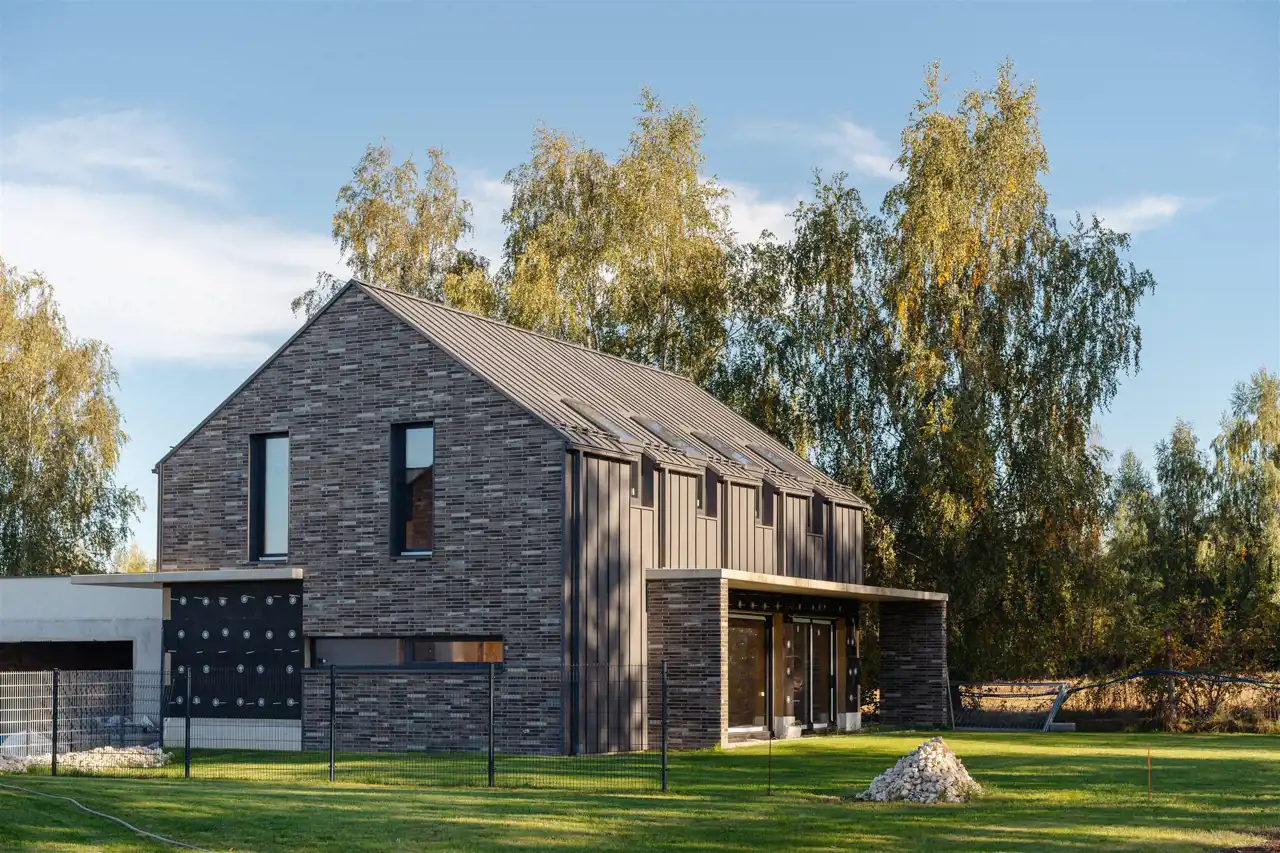 Wykończenie: tynk silikonowy BAUMIT, okładziny drewnopodobne ULTRASHIELD, płytki klinkierowe INTERBAU BLINK, blacha PREFA na rąbek stojący.