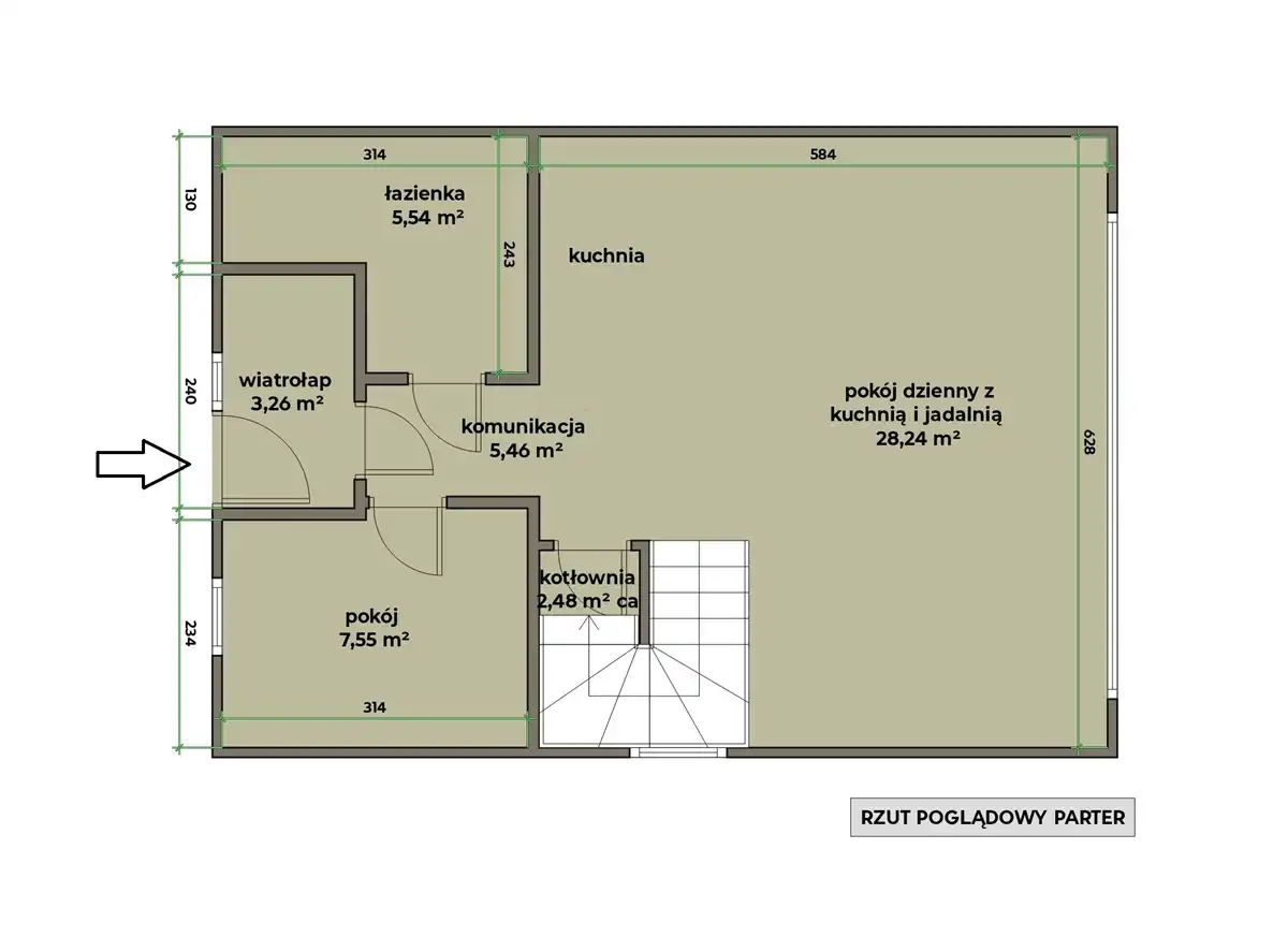 - Parter: wiatrołap, komunikacja, łazienka, kuchnia z jadalnią, salon, kotłownia, gabinet