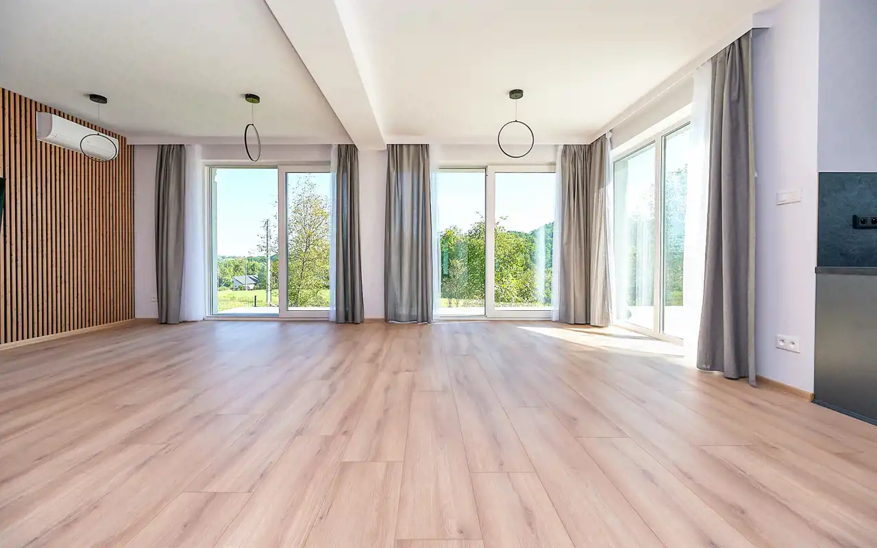 przestronny salon z aneksem kuchennym (48,40 m²), z wyjściem na taras i widokiem na ogród,
