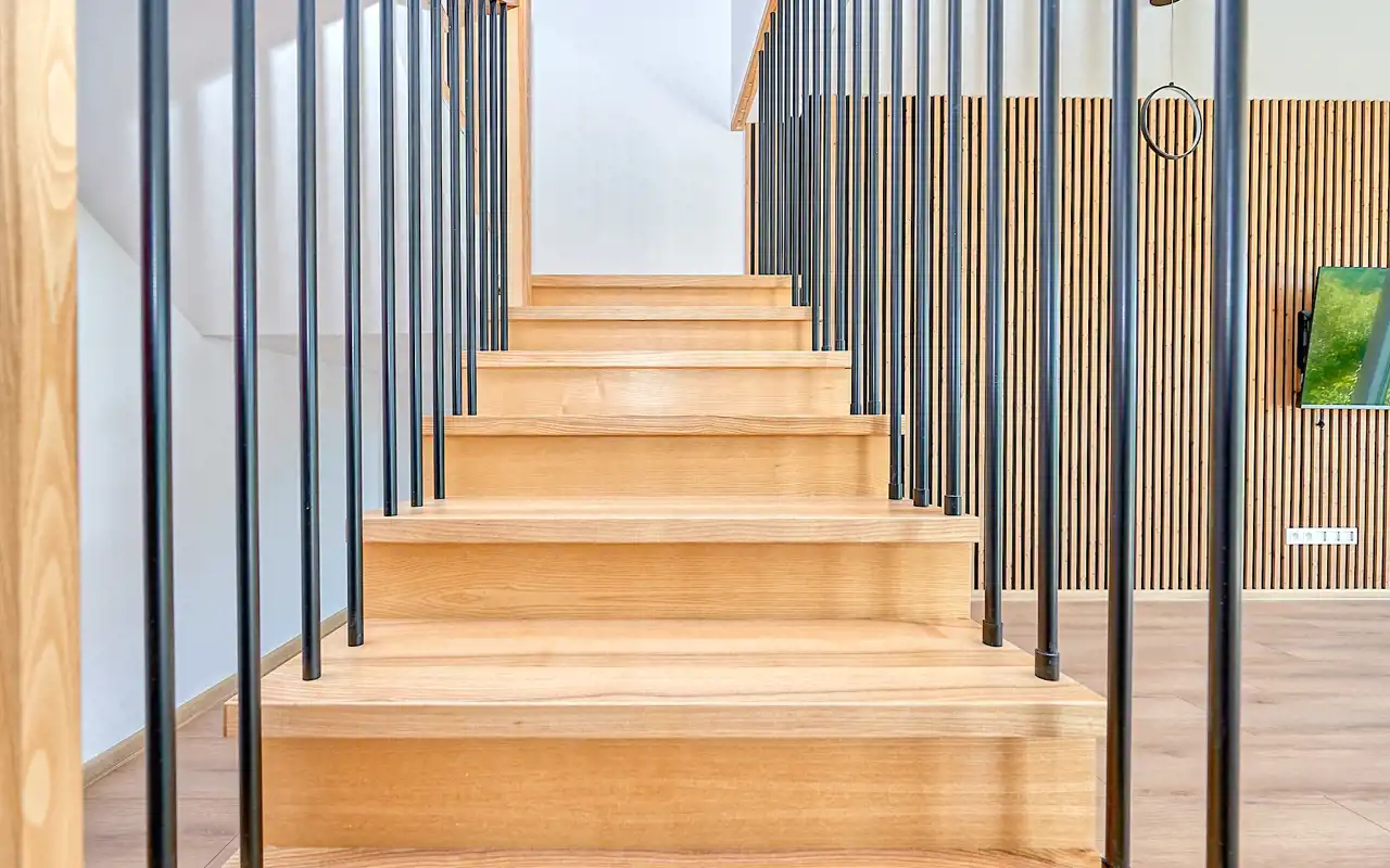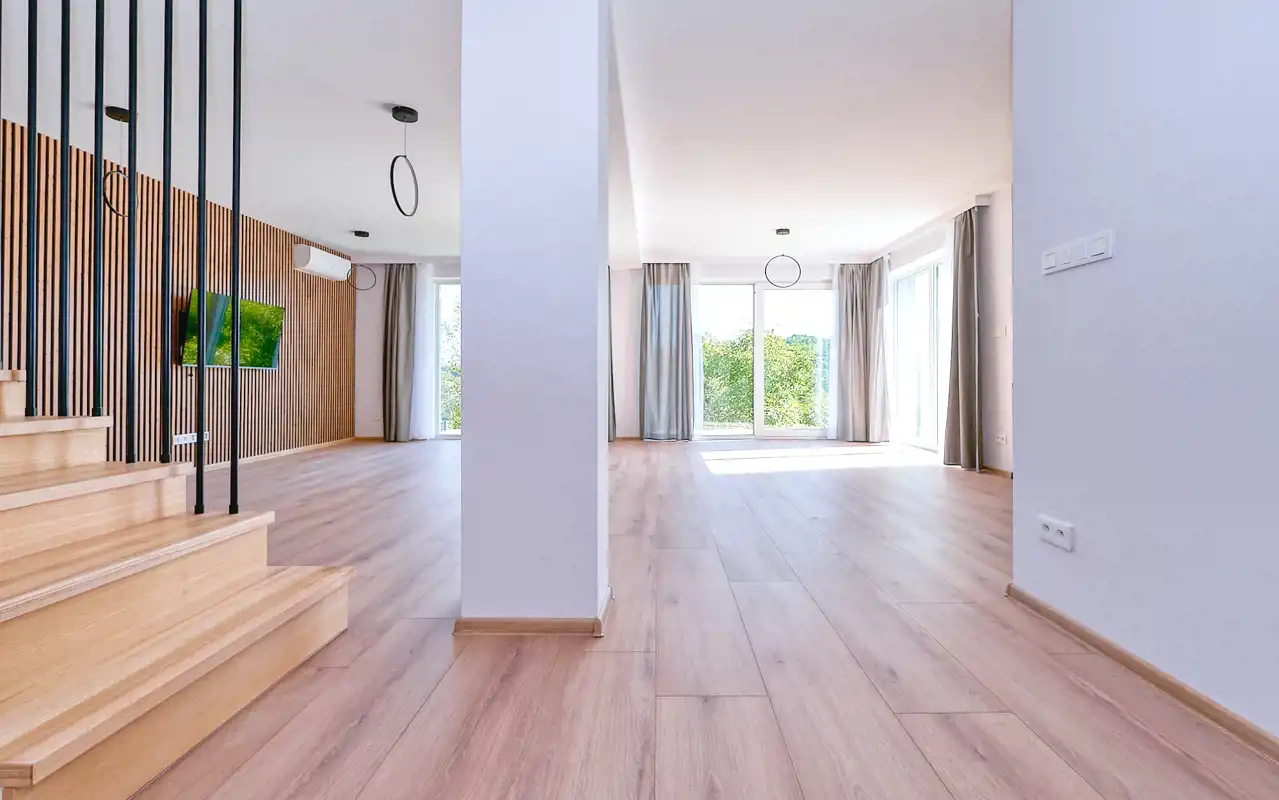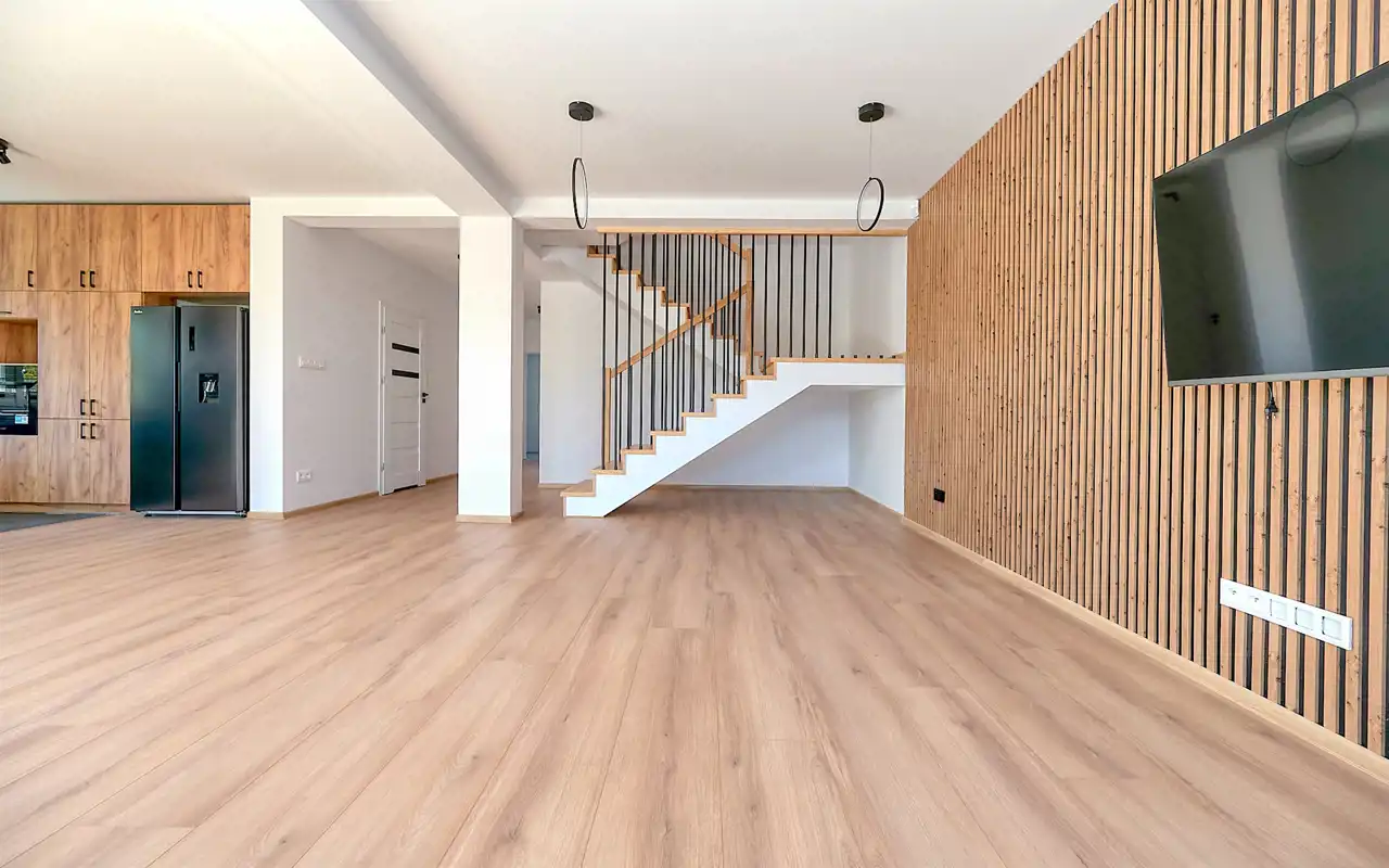 całość jasna i nowoczesna, z pięknymi schodami prowadzącymi na górę.