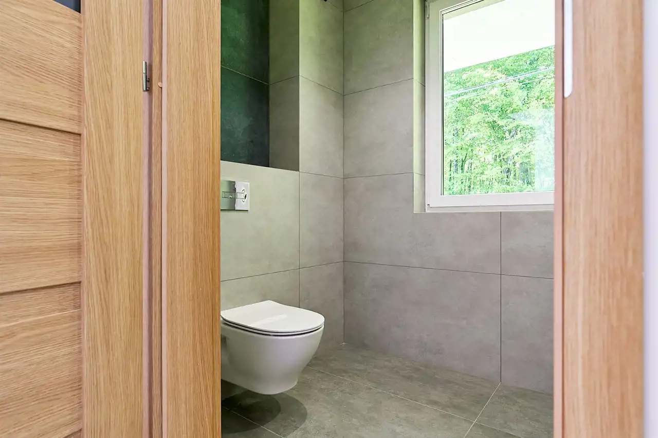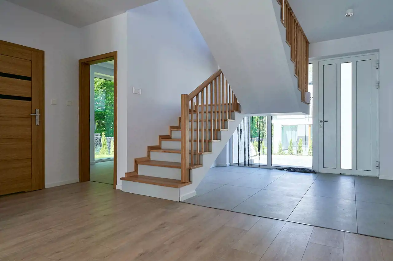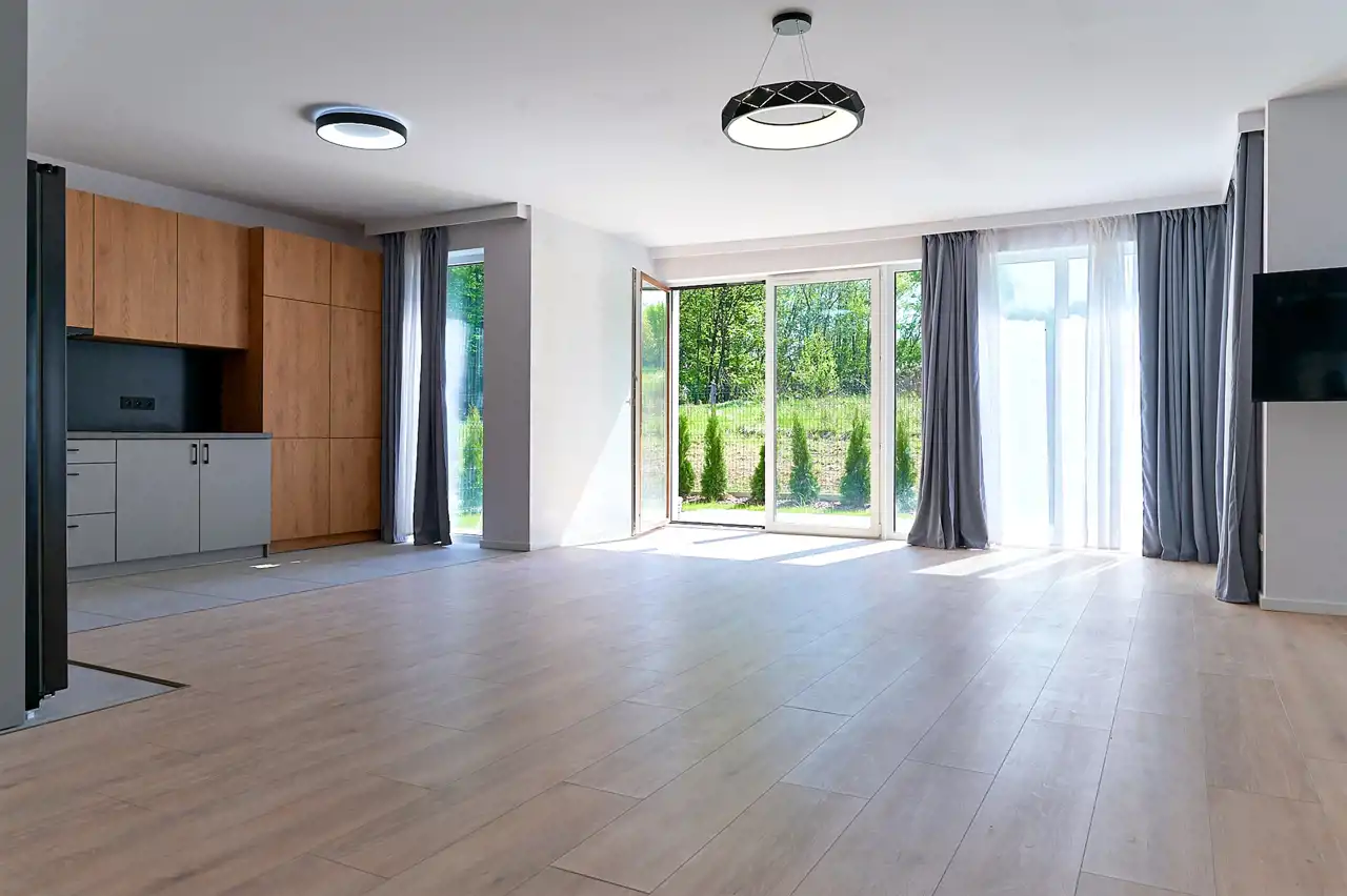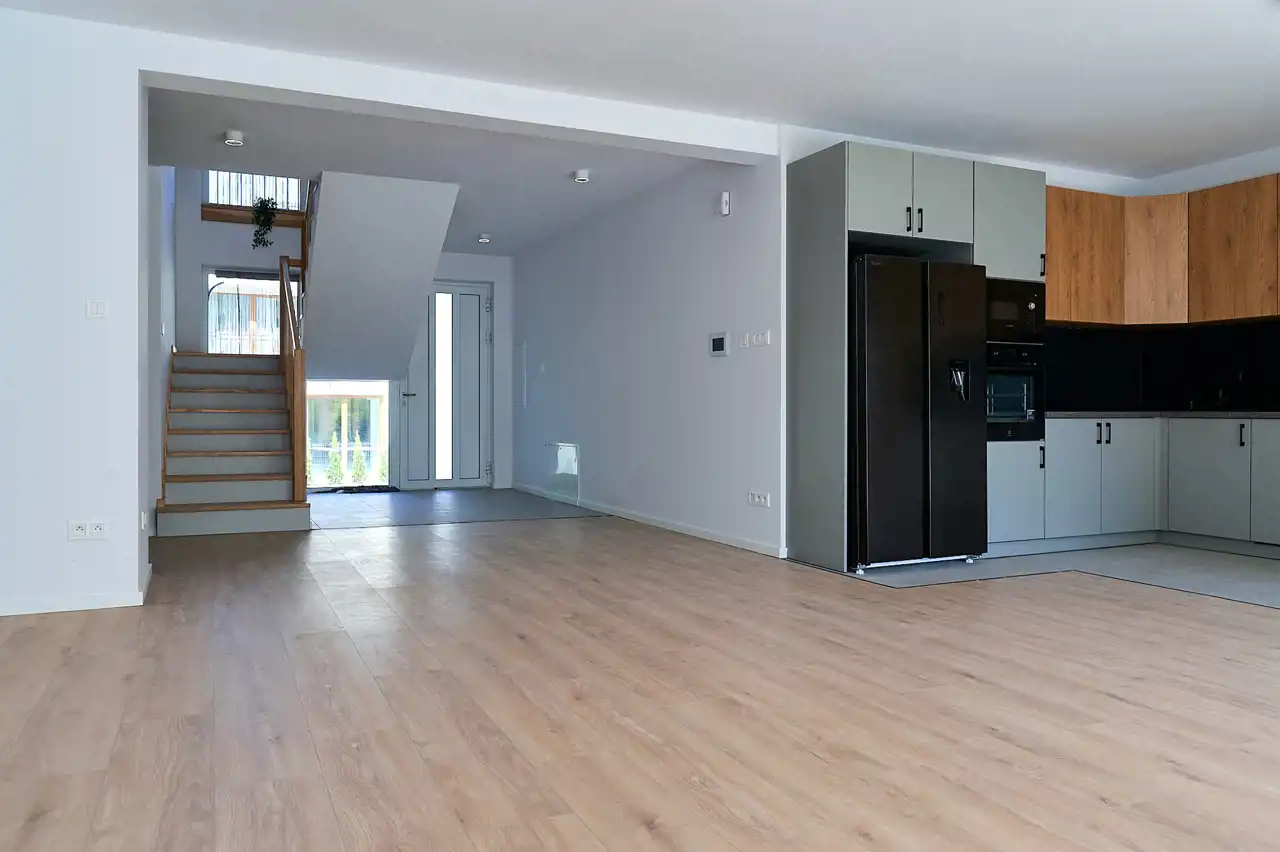Parter - salon z aneksem kuchennym (32m2) z wyjściem na taras i do ogrodu, gabinet (15m2), toaleta, holl