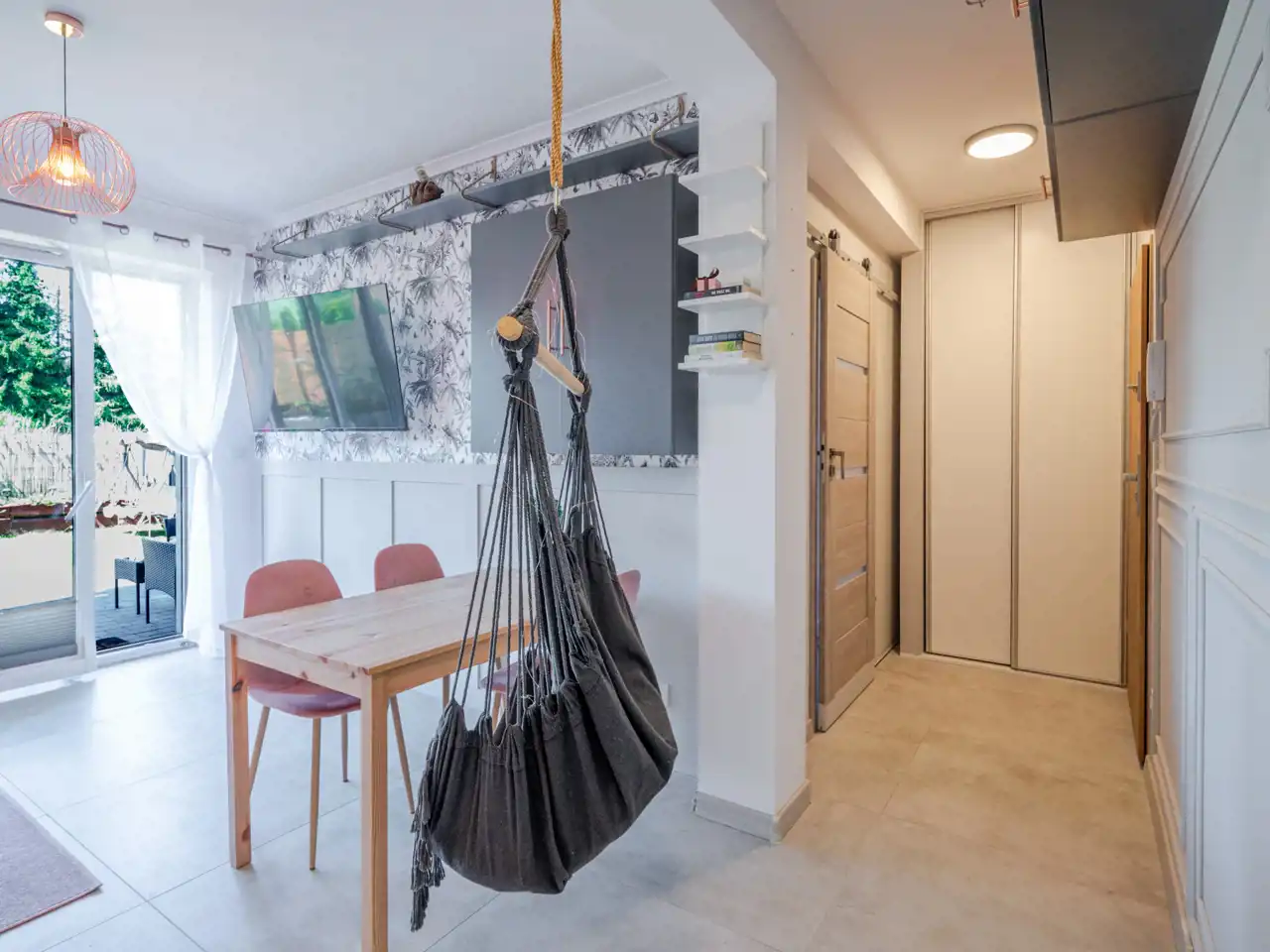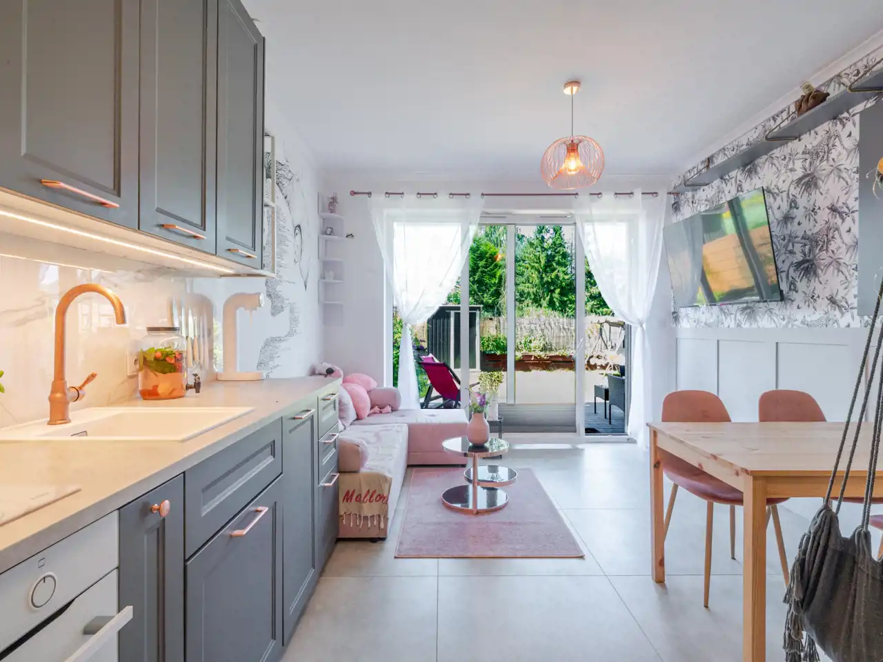- przestronnego i jasnego salonu z aneksem kuchennym oraz wyjściem do ogródka