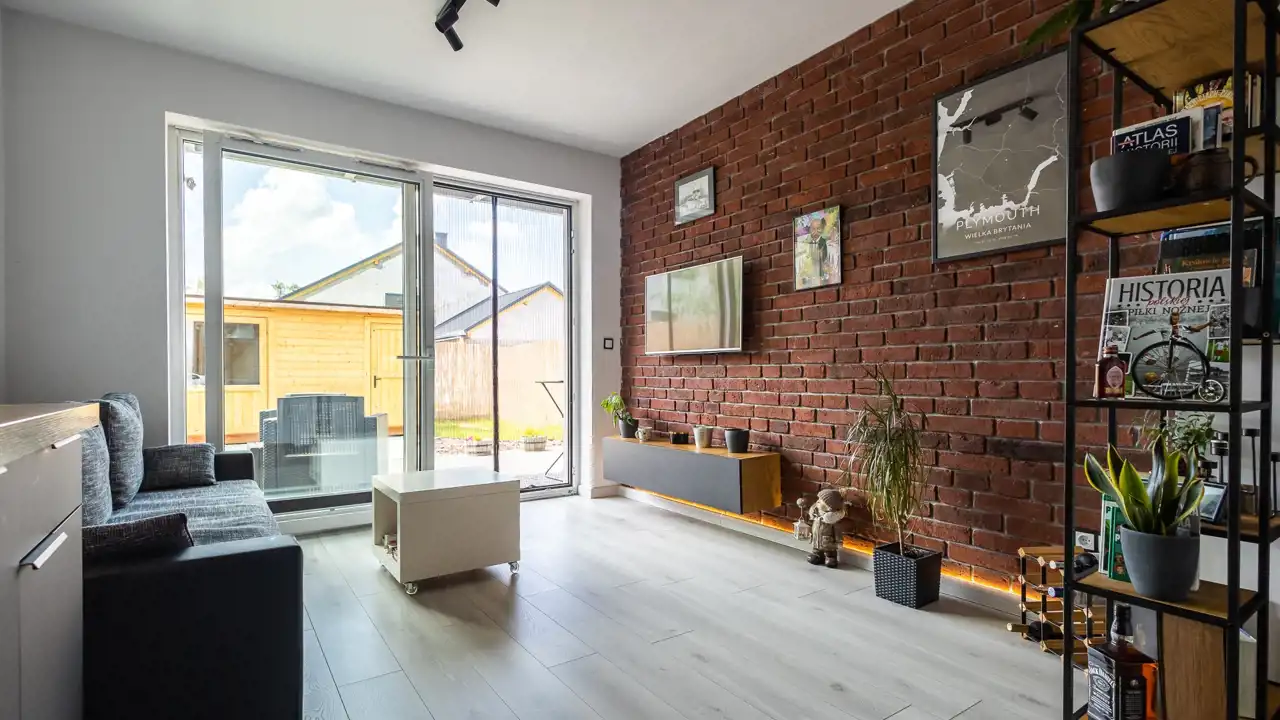 - przestronnego, bardzo ładny i jasny salon z aneksem kuchennym oraz wyjściem do ogródka