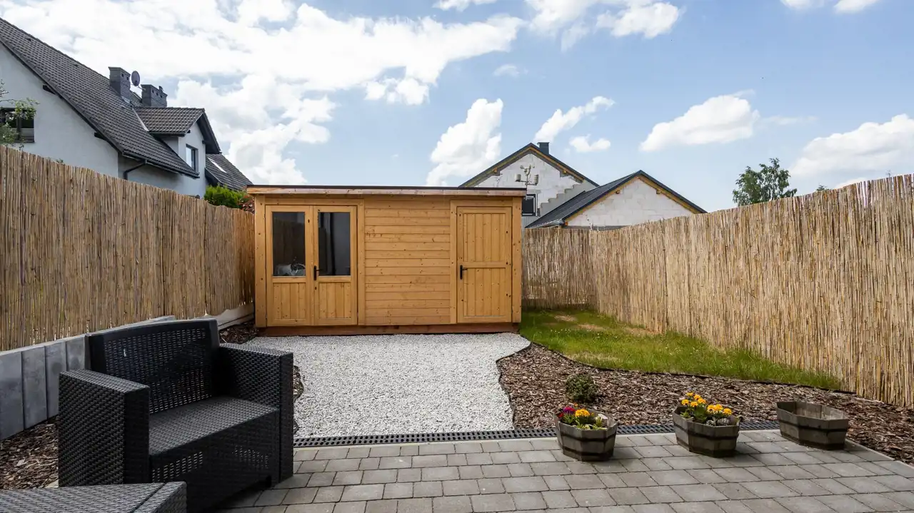 Ogródek o pow. 55m2 posiada drewniany domek, który może służyć jako pomieszczenie gospodarcze oraz miesce do pracy (w tej chwili tak jest zaaranżowane)