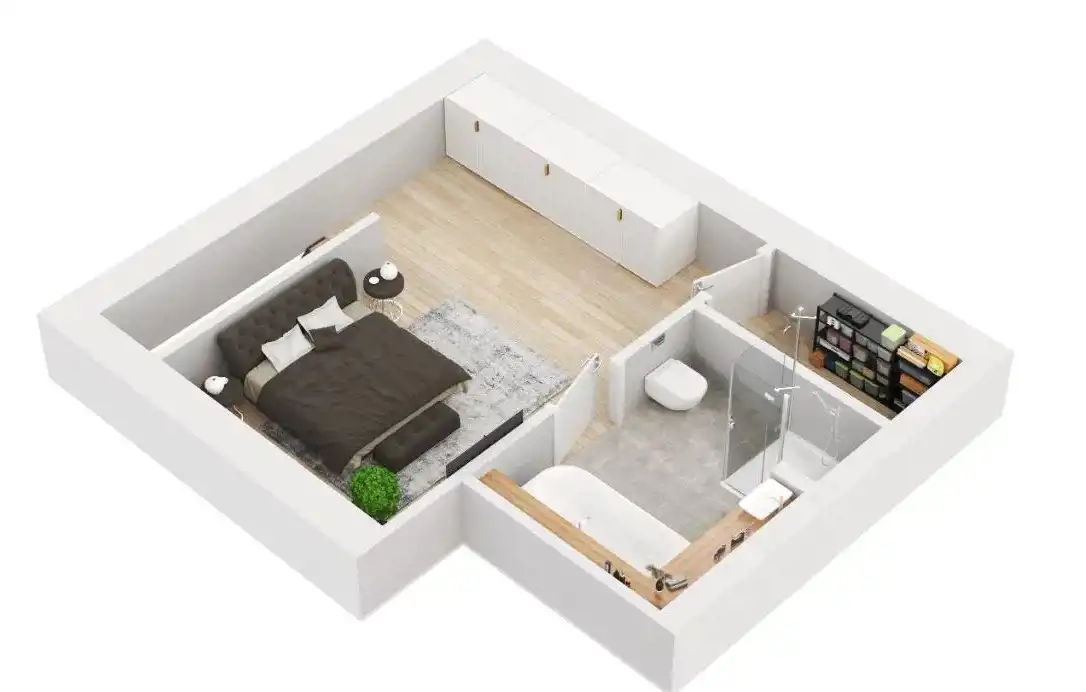 Poziom I: salon z aneksem kuchennym, sypialnia, łazienka oraz wiatrołap