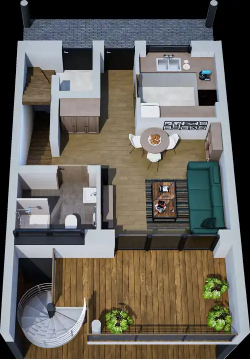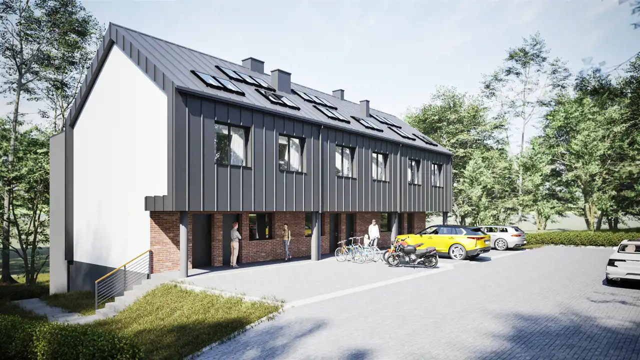 Oferujemy dwupoziomowe mieszkania w wyjątkowej architekturze przypominającej nowoczesną stodołę, idealne dla osób szukających spokoju i bliskości natury.