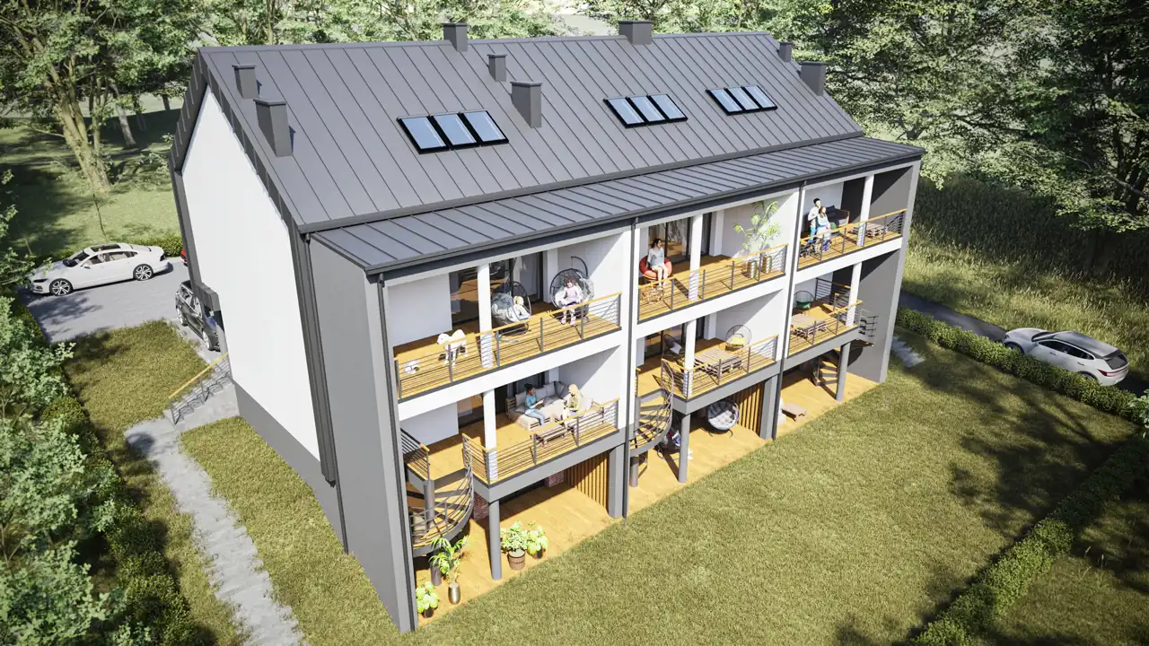 Oferujemy dwupoziomowe mieszkania w wyjątkowej architekturze przypominającej nowoczesną stodołę, idealne dla osób szukających spokoju i bliskości natury.