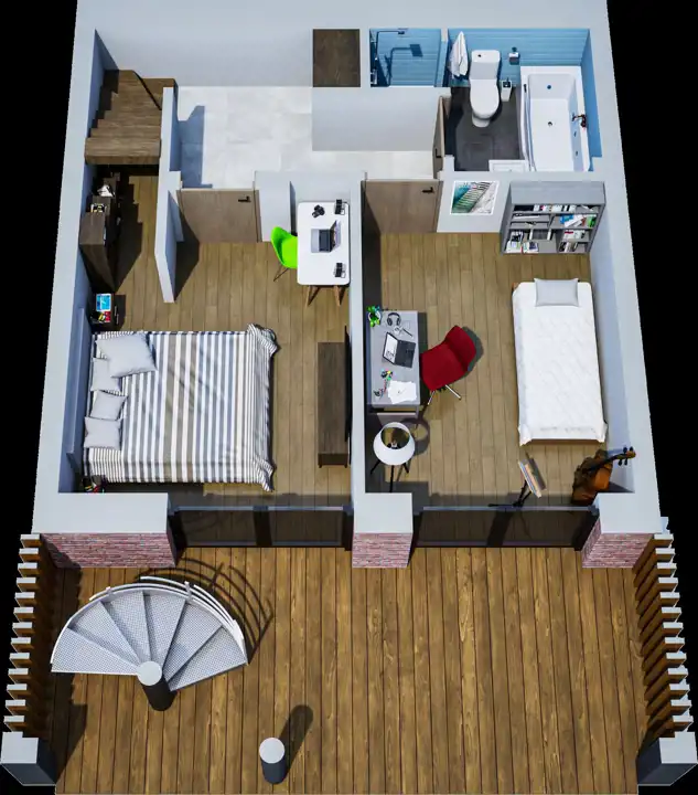 Oferujemy dwupoziomowe mieszkania w wyjątkowej architekturze przypominającej nowoczesną stodołę, idealne dla osób szukających spokoju i bliskości natury.