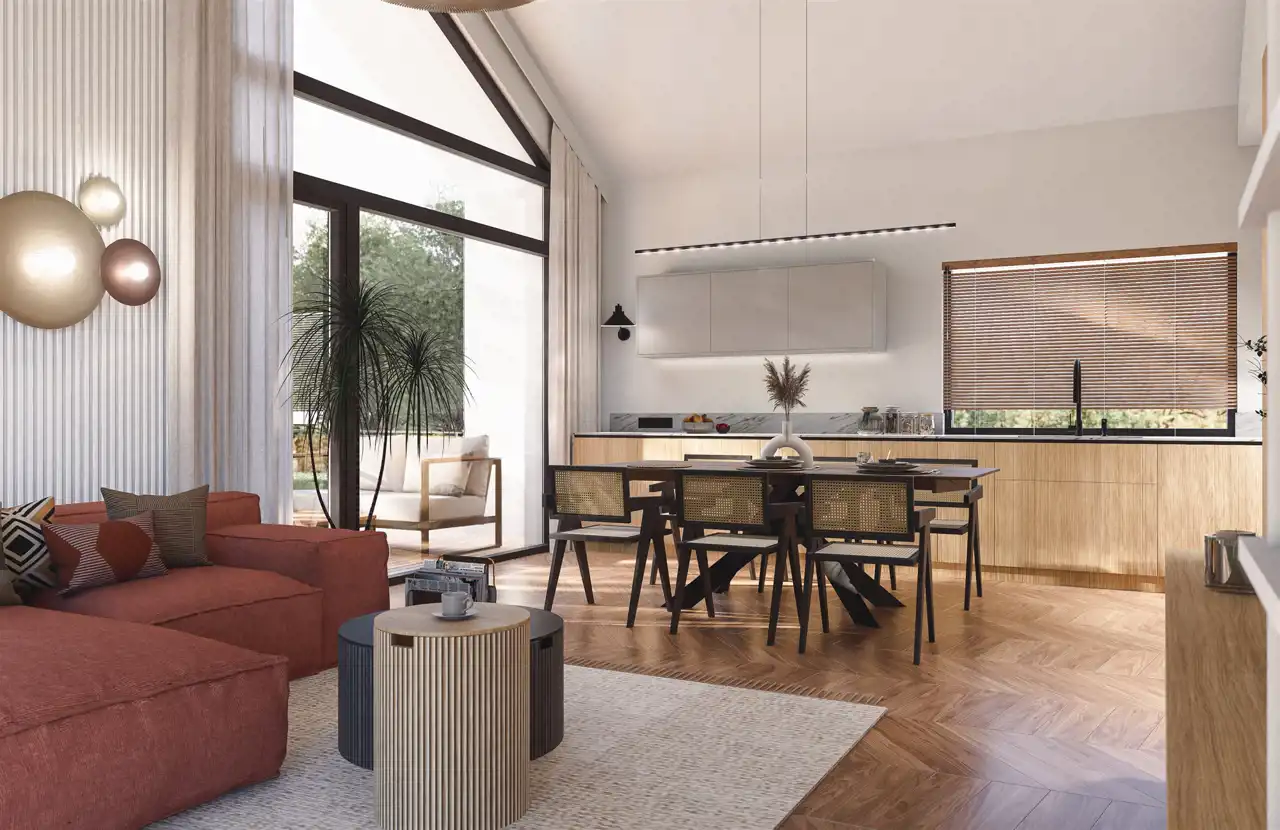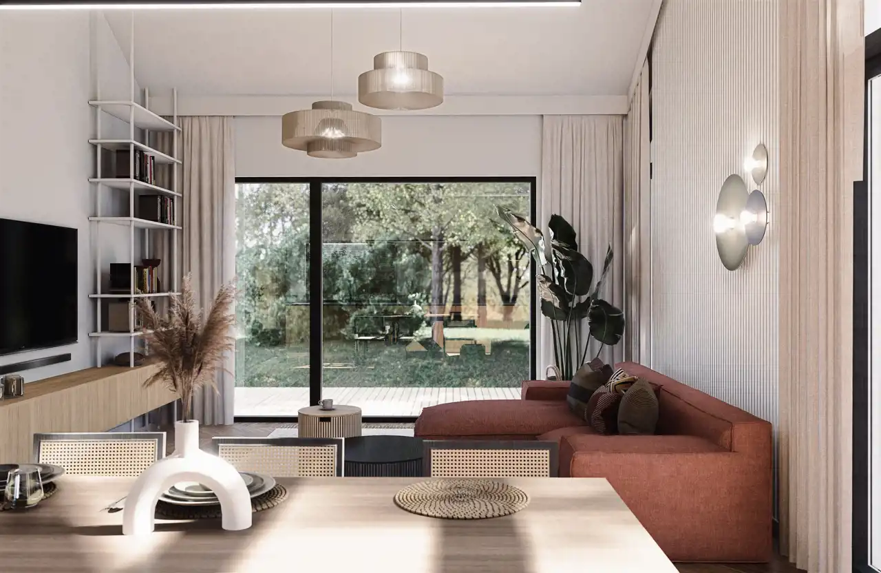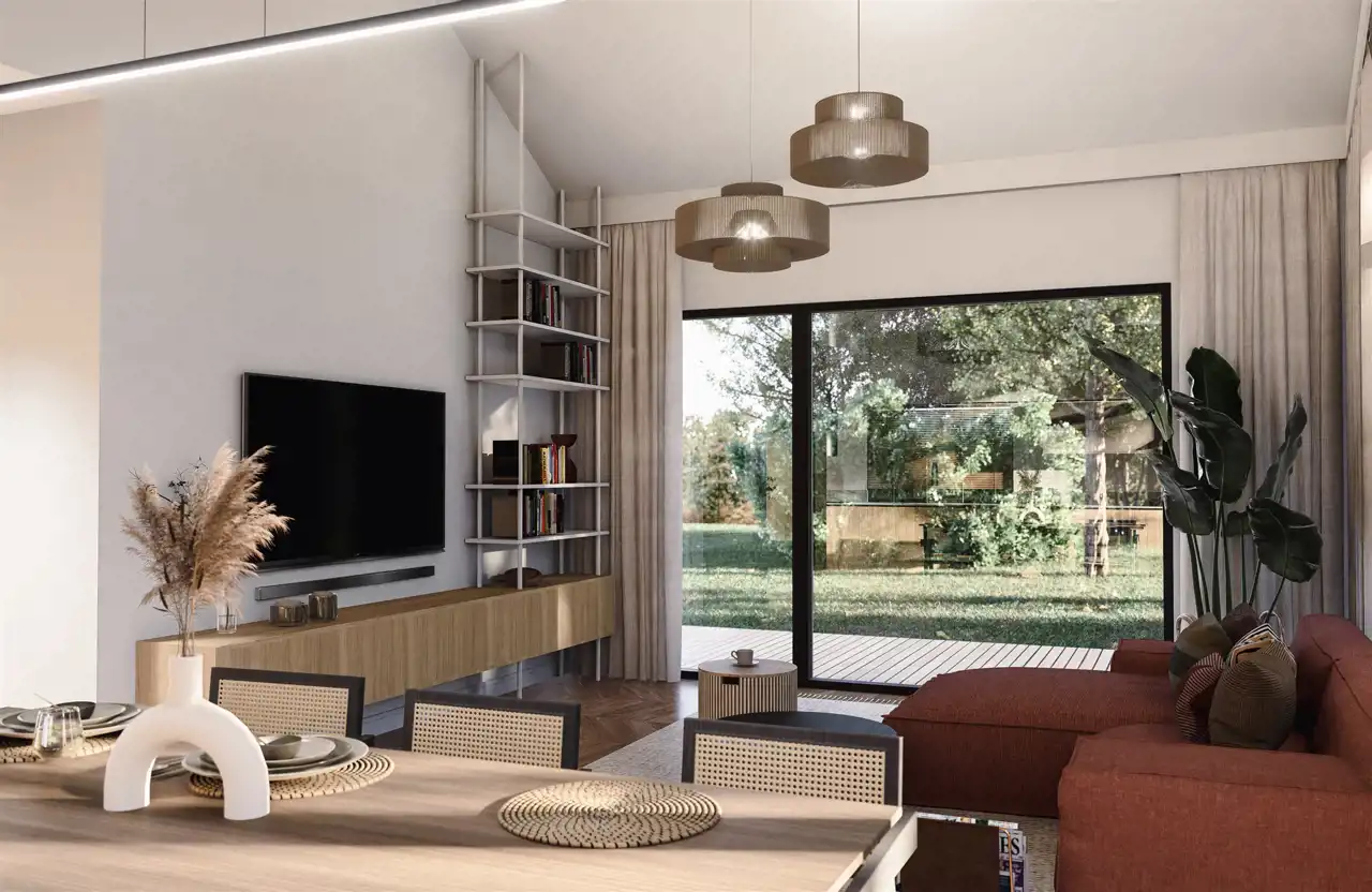 Dom z dachem dwuspadowy. Salon przestronny, otwarty. W salonie okno tarasowe, wyjście na ogród. Trzy sypialnie, hol, dwie łazienki (w załączniku rzuty i powierzchnie pomieszczeń ).