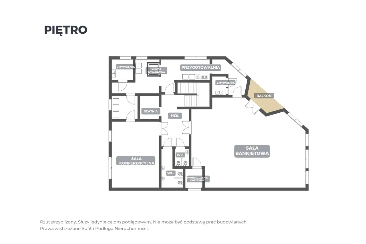 - sala bankietowa (141m2), z wyjściem na balkon i odrębnym pomieszczeniem orkiestry