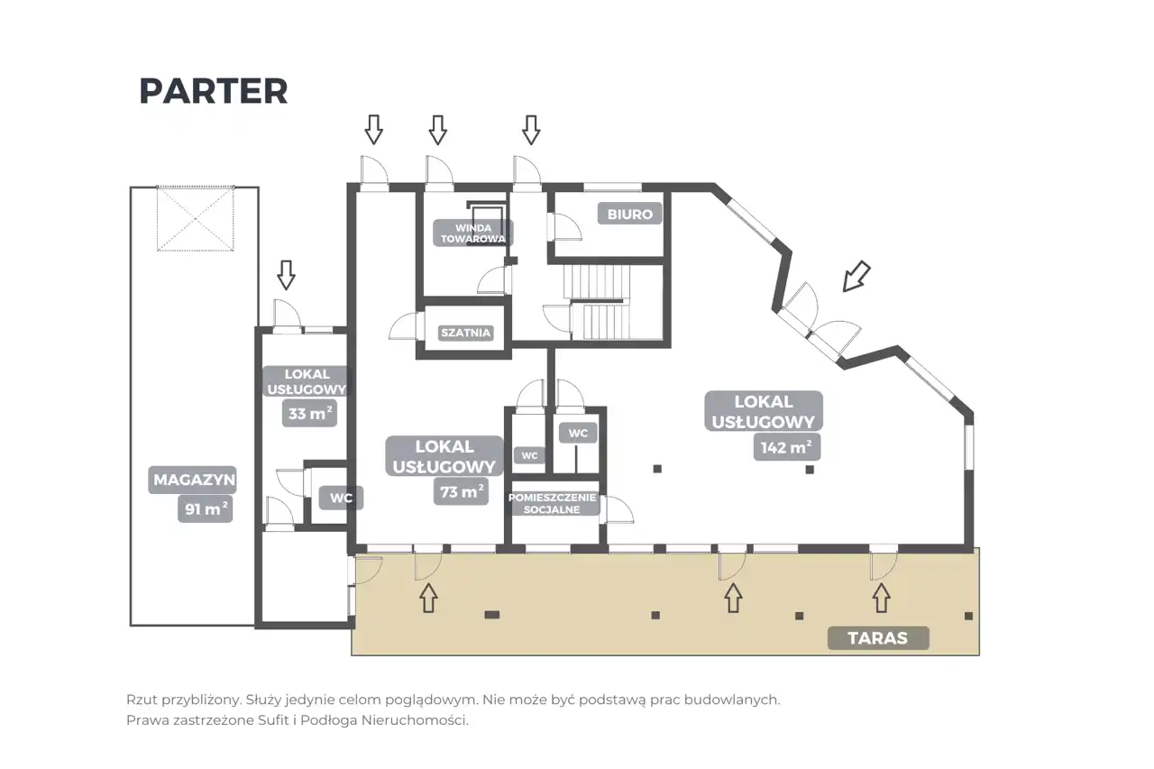 - pomieszczenia związane z organizacją imprez na I piętrze: szatnia i umywalnia pracowników, magazyn opakowań, winda towarowa.
