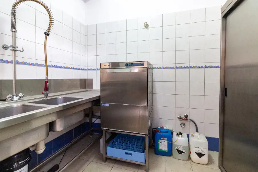- zaplecze gastronomiczne przystosowane do obsługi cateringu: rozdzielnia kelnerska, przygotowalnia, dwa pomieszczenia myjni, magazyn produktów spożywczych, magazyn napojów.