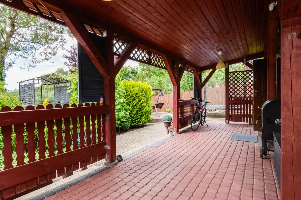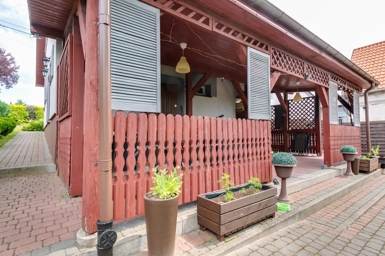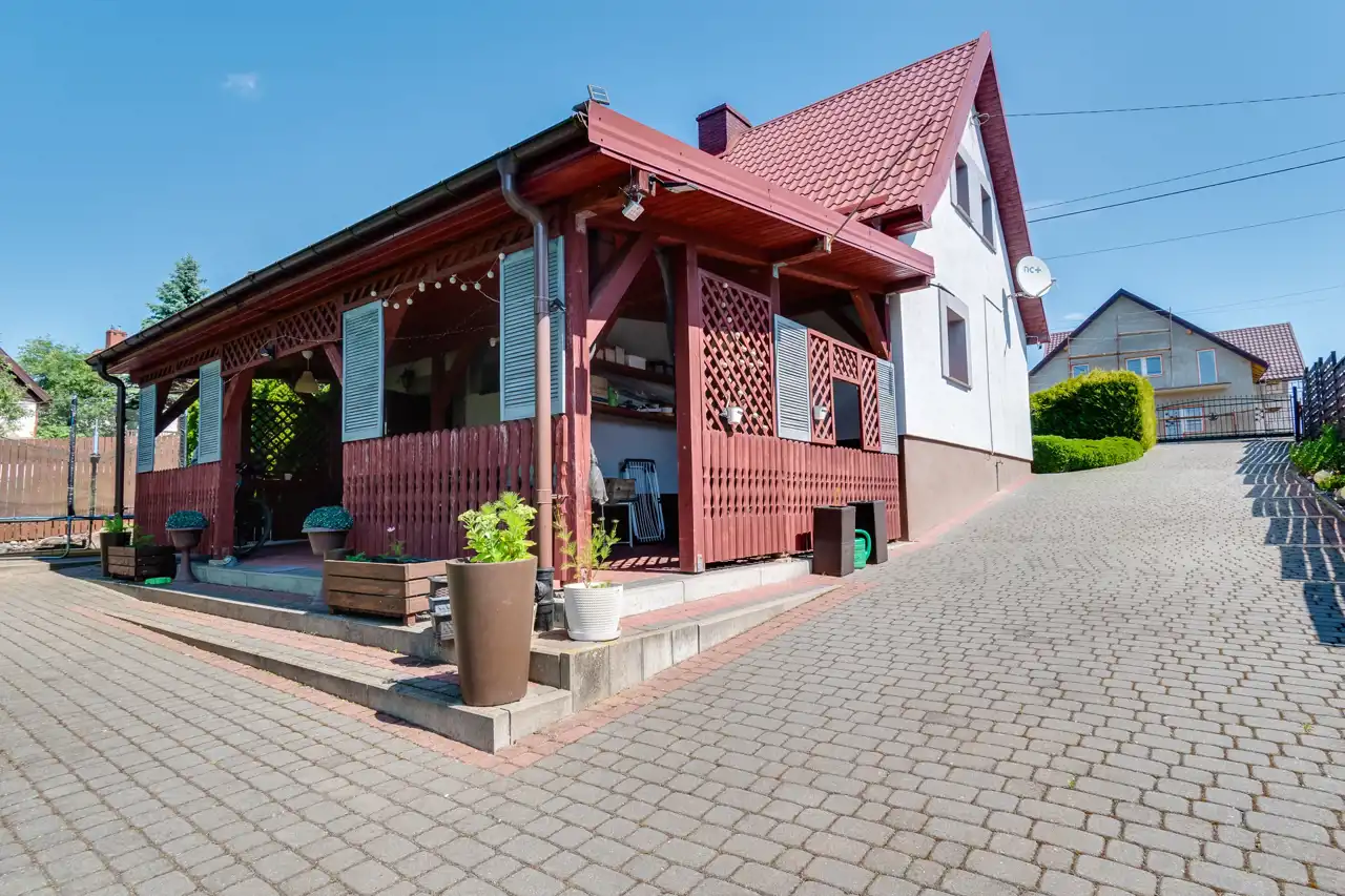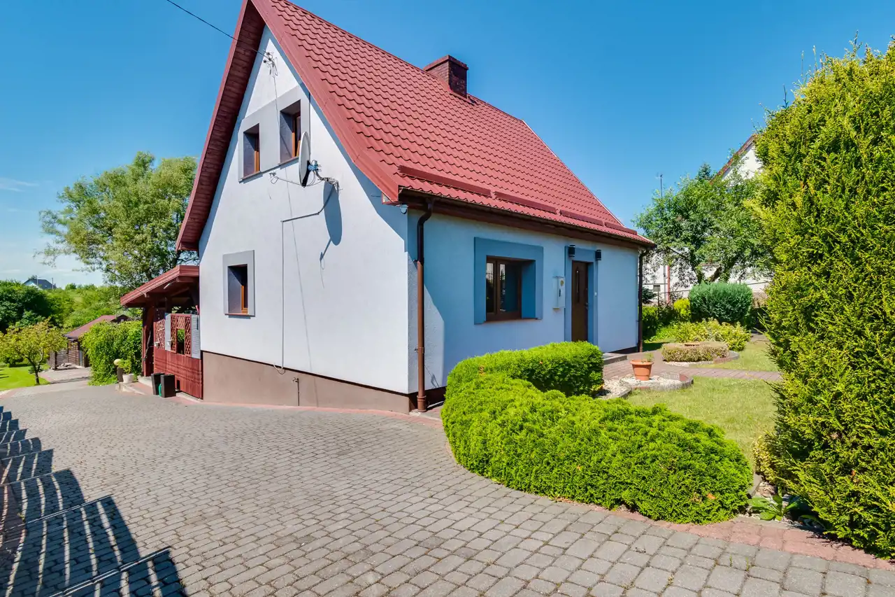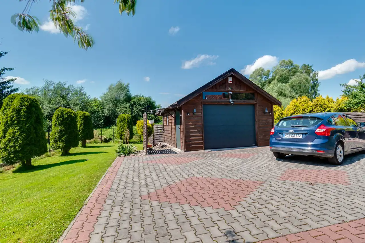Dom ocieplony wybudowany technologią tradycyjną czyli cegłą. Okna plastikowe dwuszybowe. Dach pokryty blachodachówką. Drzwi antywłamaniowe firmy Gerda. Posesja ogrodzona, natomiast wjazd przez bramę na pilota. Na działce znajduje się dobrze zagospodarowane miejsce na drewno oraz garaż o powierzchni 30m. Dom monitorowany.