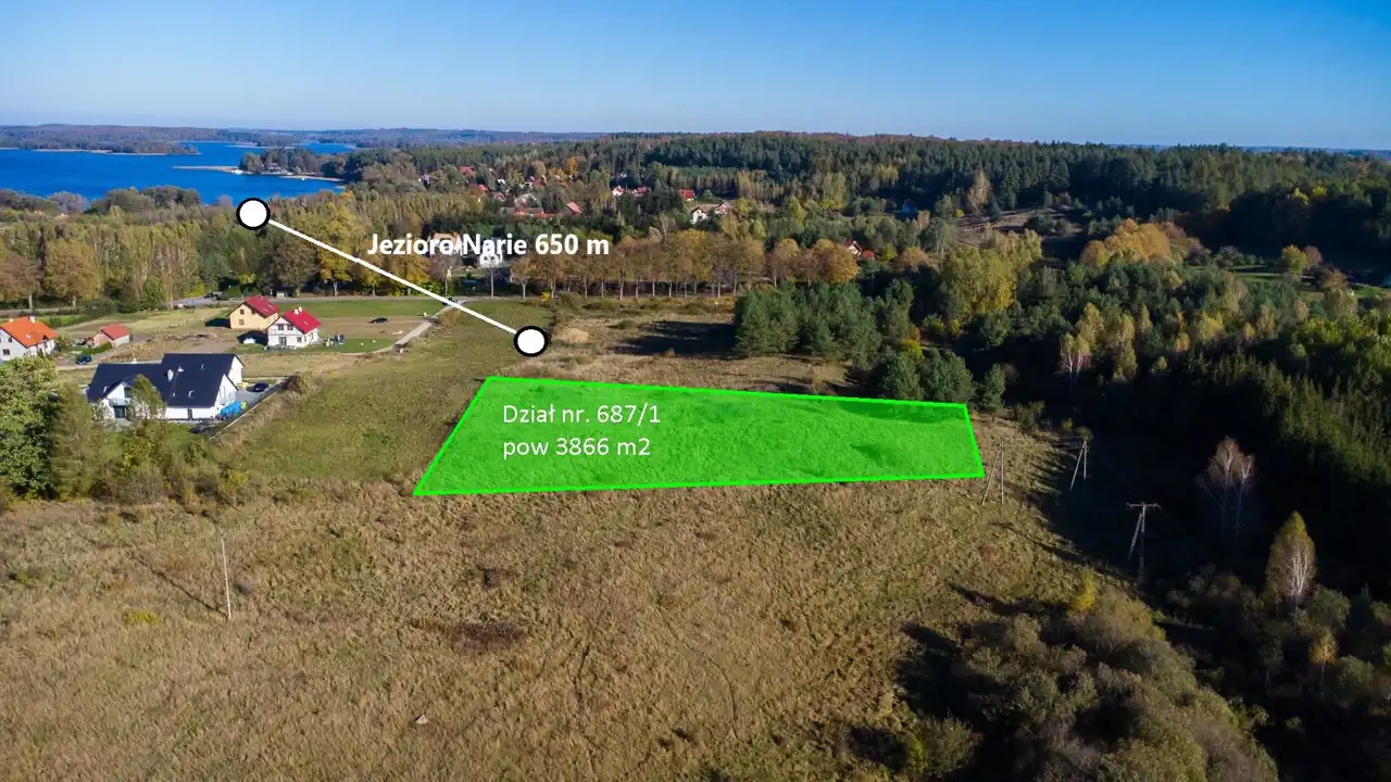 Nieruchomość o powierzchni 3885 m2 ( możliwość odsprzedania 1/2 udziału, przy czym cena podlega negocjacji), położona w odległości około 600 metrów od jeziora Narie i 2000 metrów od głównego zaplecza handlowo-rekreacyjnego.