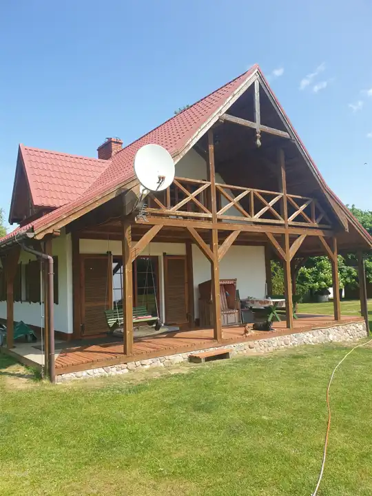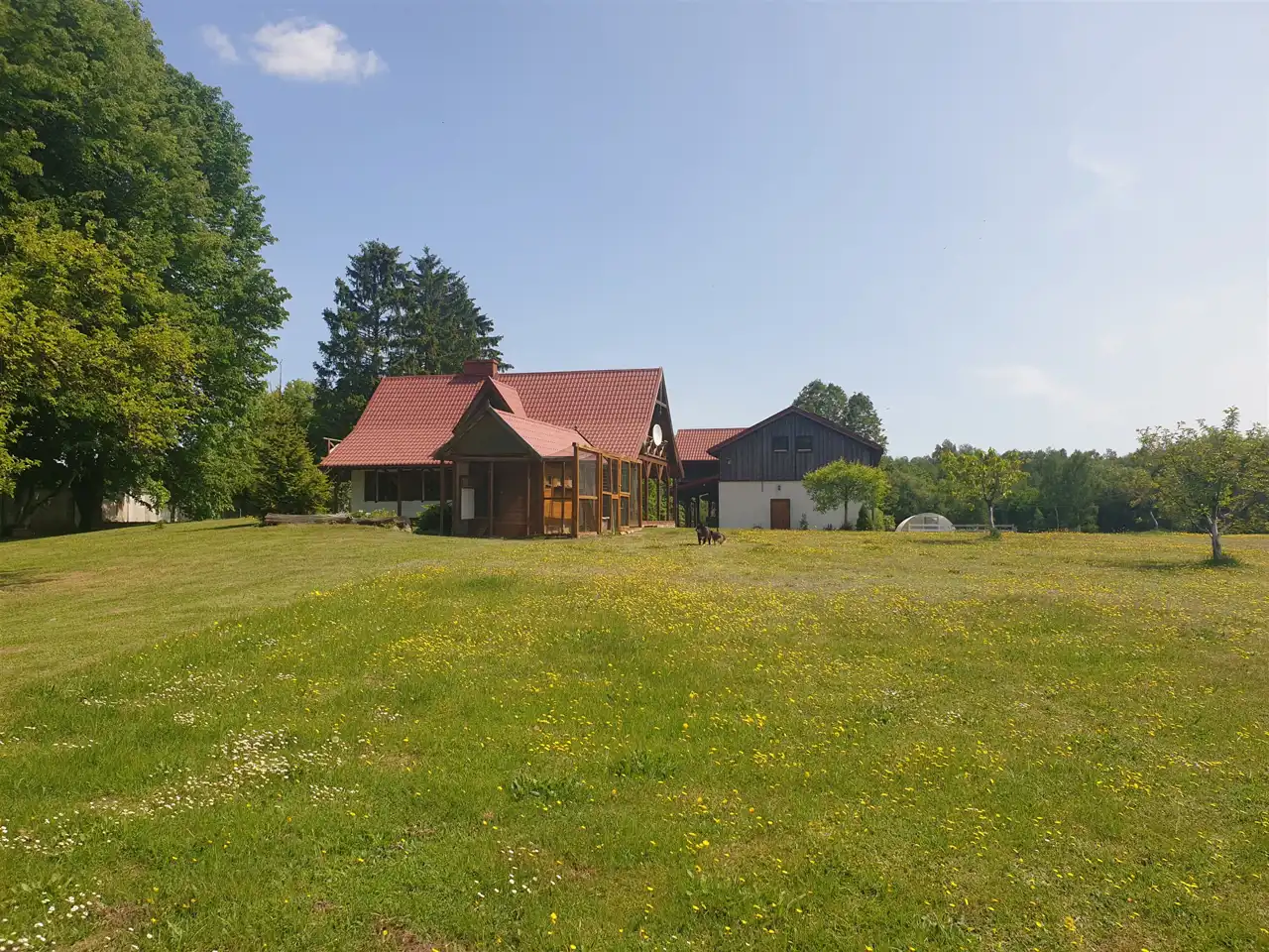Posiadłość składa się z ośmiu działek gruntowych położonych obok siebie i zajmuje łączną powierzchnię 22,79 ha. Na jednej z działek znajduje się budynek mieszkalny, 2,0-kondygnacyjny, wolnostojący, częściowo podpiwniczony, murowany z cegły ceramicznej i przebudowany w 2006r.. Budynek składa się z położonego na parterze otwartego salonu, kuchni i łazienki oraz jednego otwartego pokoju zajmującego całe poddasze. Okna drewniane skrzynkowe, nowe z drewnianymi okiennicami. Stolarka drzwiowa drewniana nowa wykonana na wymiar. Podłogi nowe deski drewniane malowane lakierem bezbarwnym w pokojach, w pozostałych pomieszczeniach – płytki ceramiczne. Instalacja elektryczna, wodociągowa, kanalizacyjna i teletechniczna. Ogrzewanie centralne z piecem dwufunkcyjnym na olej opałowy umiejscowionym w piwnicy. Instalacja fotowoltaiczna na budynku gospodarczym. Dach dwuspadowy kryty blachodachówką. Uroku domowi dodaje zadaszony drewniany balkon z widokiem na rozpościerający się krajobraz –łąk i lasów, a zadaszony taras na poziomie parteru pozwala na relaks o każdej porze dnia. Powierzchnia zabudowy 82m2, zaś powierzchnia użytkowa wynosi 99m2. Budynek w stanie technicznym bardzo dobrym.