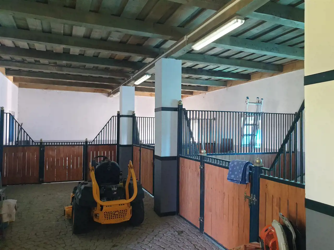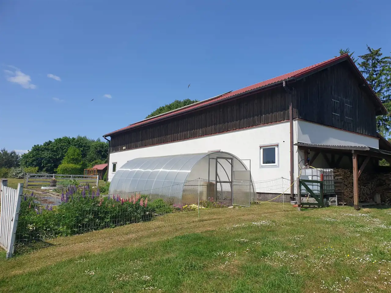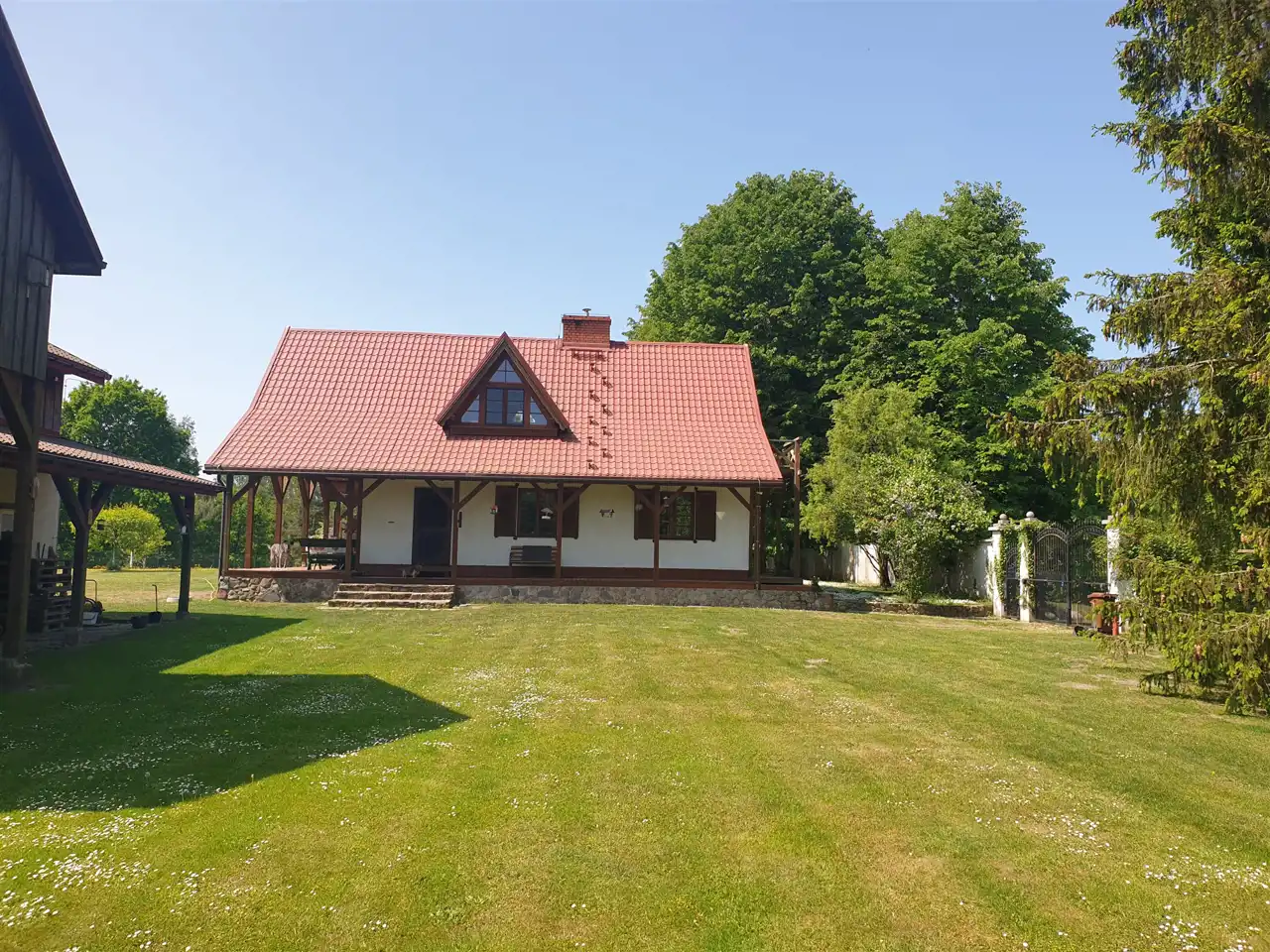 Oprócz domu na działce posadowione są dwa budynki gospodarcze; jeden murowany z cegły, drugi garażowy drewniany z 2010r., dach dwuspadowy kryty blachodachówką, posadzki betonowe, stolarka okienna typu inwentarskiego, stolarka drzwiowa drewniana, w budynku gospodarczym znajdują się pomieszczenia socjalne z kuchnią oraz część stajni z boksami dla koni, powierzchnia zabudowy budynku murowanego 225m2 i 70m2 budynku garażowego , dobry stan techniczny. Na terenie posiadłości znajduje się trzeci budynek gospodarczy o konstrukcji drewnianej z przeznaczeniem dla koni i niewielki kurnik do ekologicznej hodowli kur z własnym wybiegiem na potrzeby własne właścicieli. Temu celowi służy również niewielki ogród warzywny usytuowany na tyłach budynku gospodarczego.