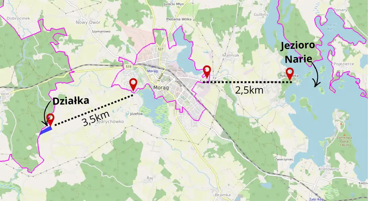 I to jest kluczowe: mimo kameralnego położenia, nieruchomość znajduje się zaledwie około 4 km od Morąga, więc w kilka minut masz dostęp do pełnej infrastruktury miasta — sklepów, usług, pracy, szkół, punktów handlowych i codziennych udogodnień.