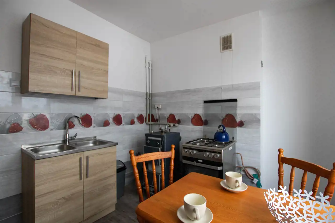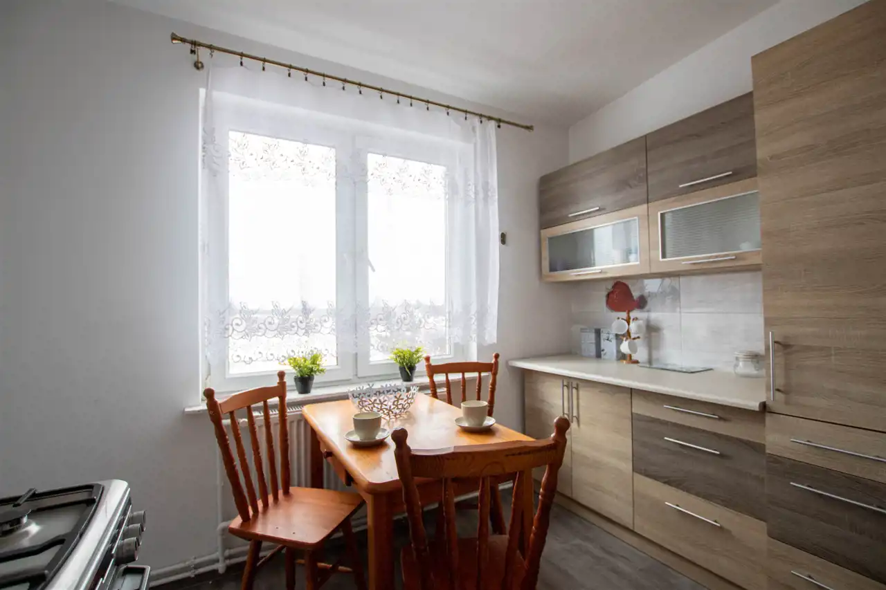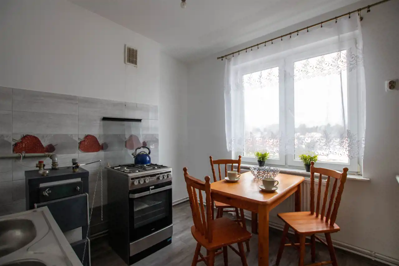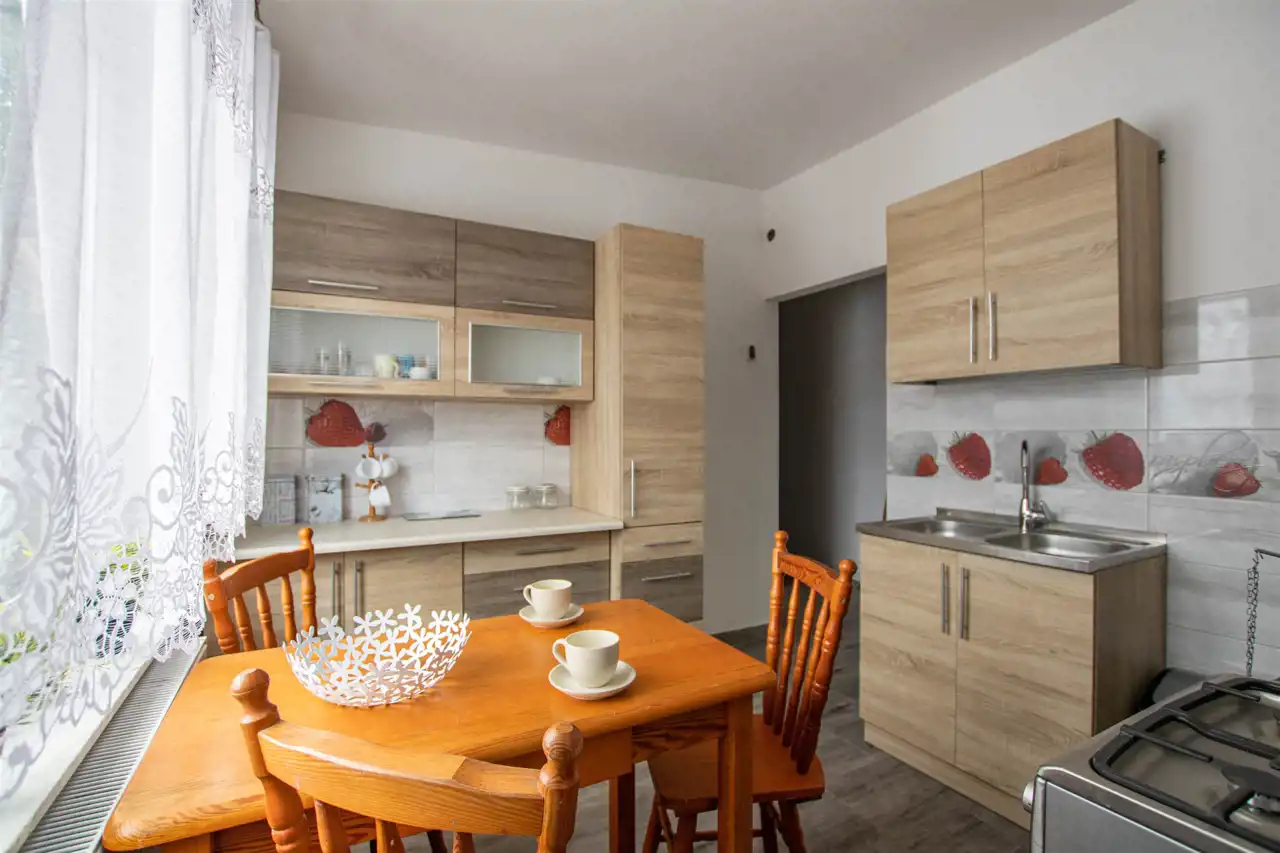 -Kuchnia: zabudowa meblowa, zlewozmywak, kuchenka, stół z krzesłami