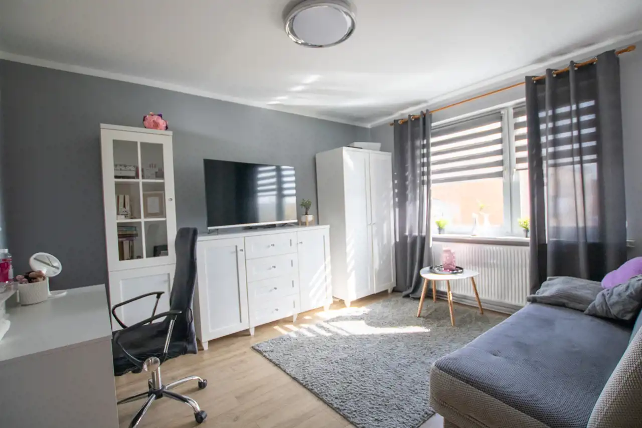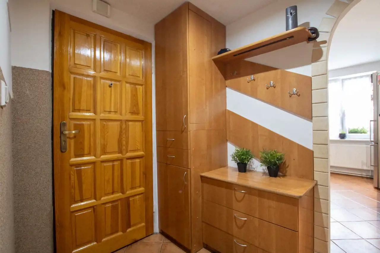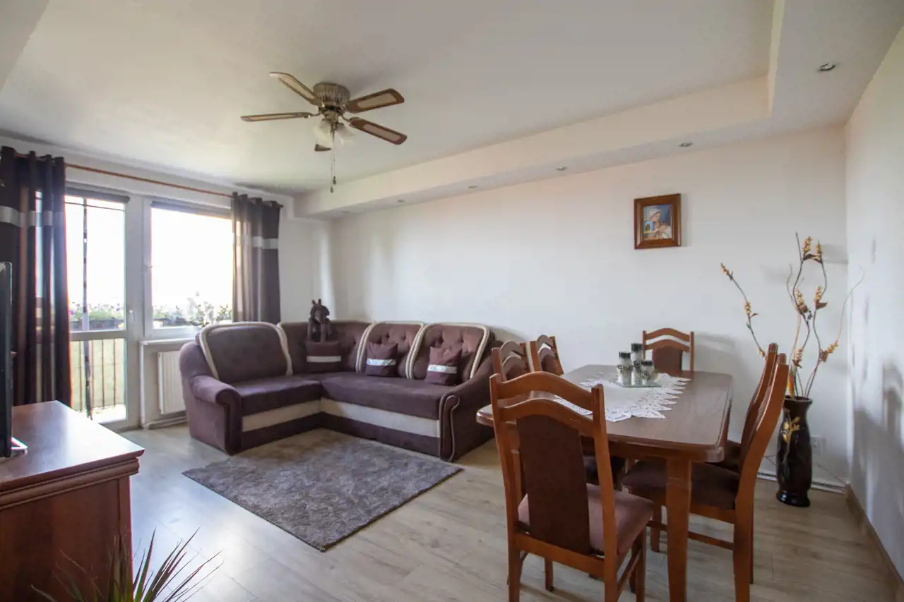- Pokój 1 ( salon ) : Kanapa narożna, zabudowa meblowa, stół z miejscem dla sześciu osób. Wyjście z salonu na przestronny balkon