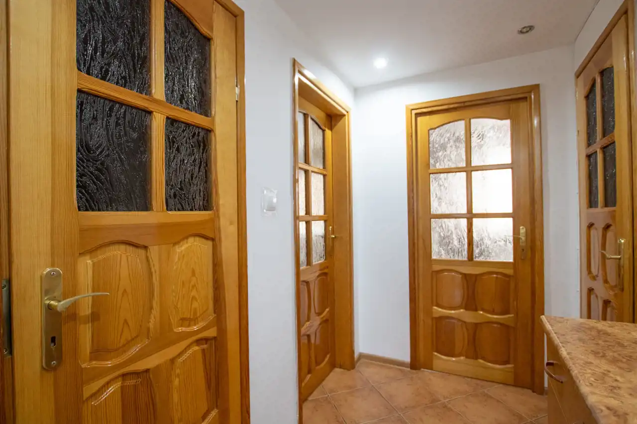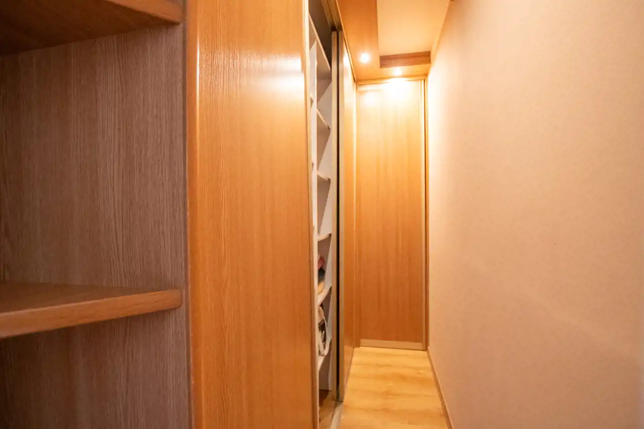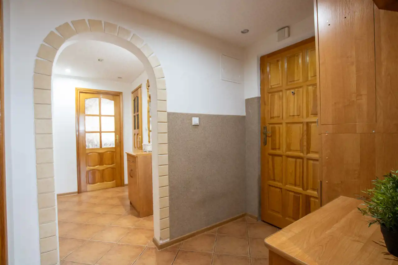 - Pokój 1 ( salon ) : Kanapa narożna, zabudowa meblowa, stół z miejscem dla sześciu osób. Wyjście z salonu na przestronny balkon