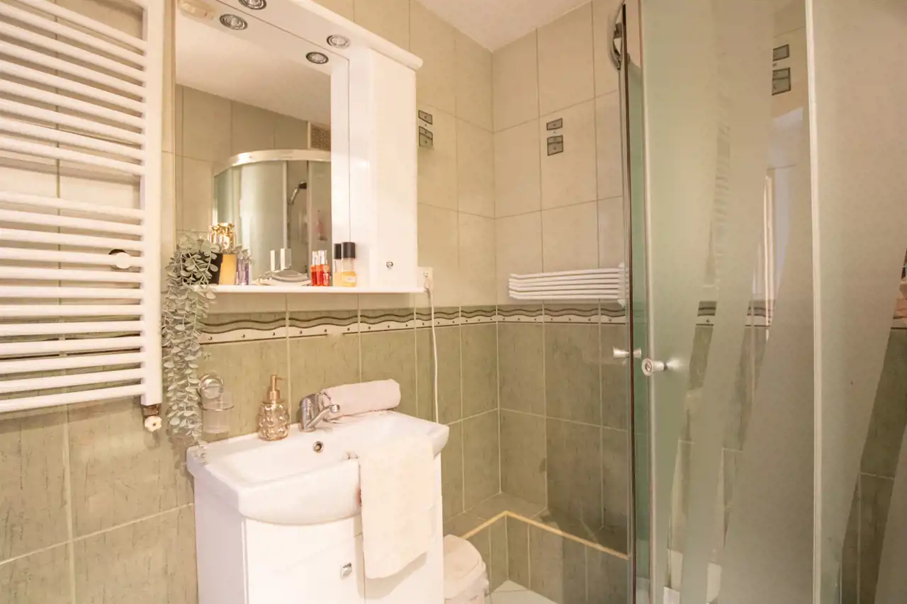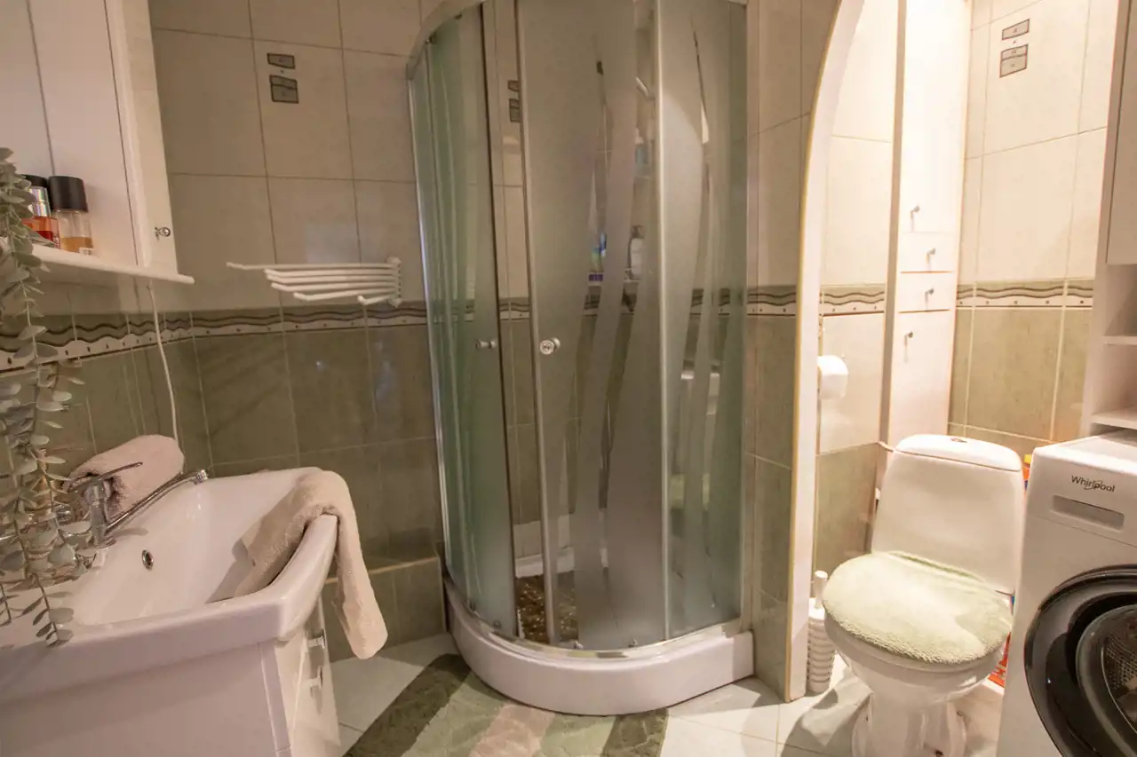 - Łazienka : Kabina prysznicowa, umywalka z miejscem do przechowywania, pralka