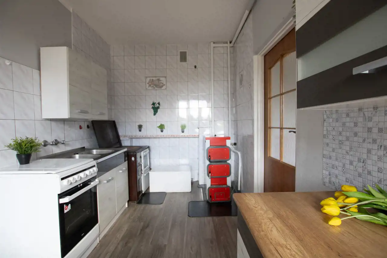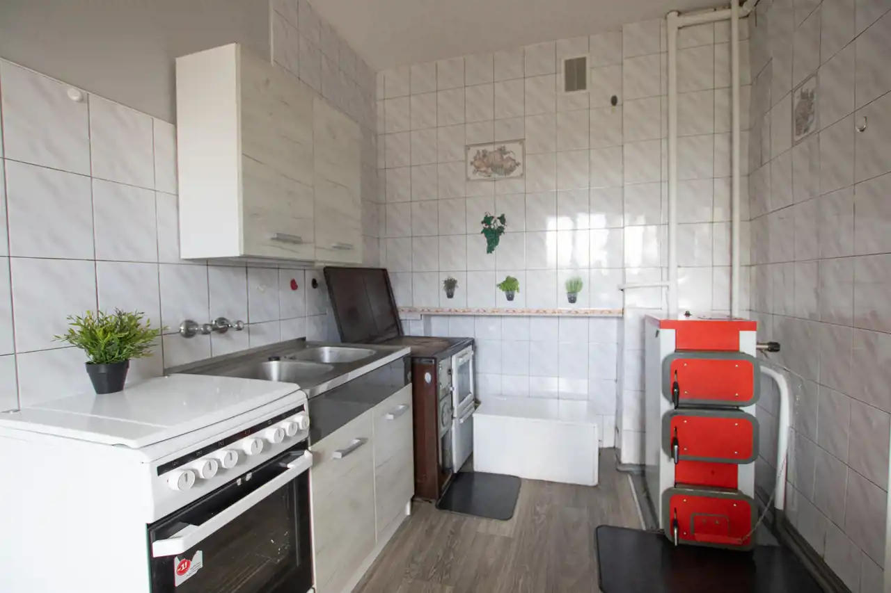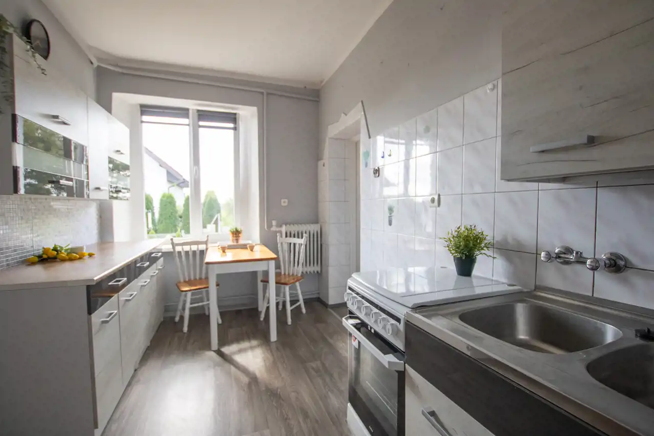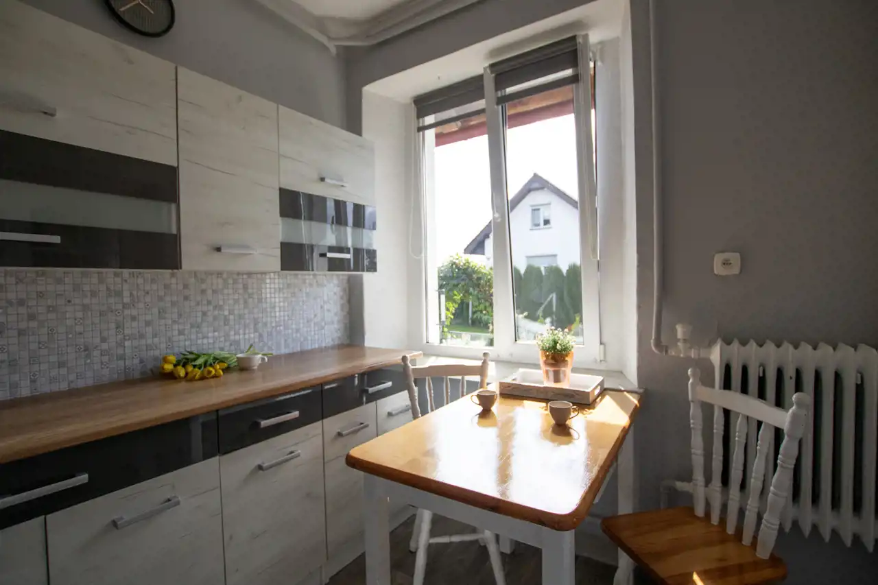 -Kuchnia: Zabudowa meblowa, zlewozmywak, kuchenka, stół z miejscem dla dwóch osób