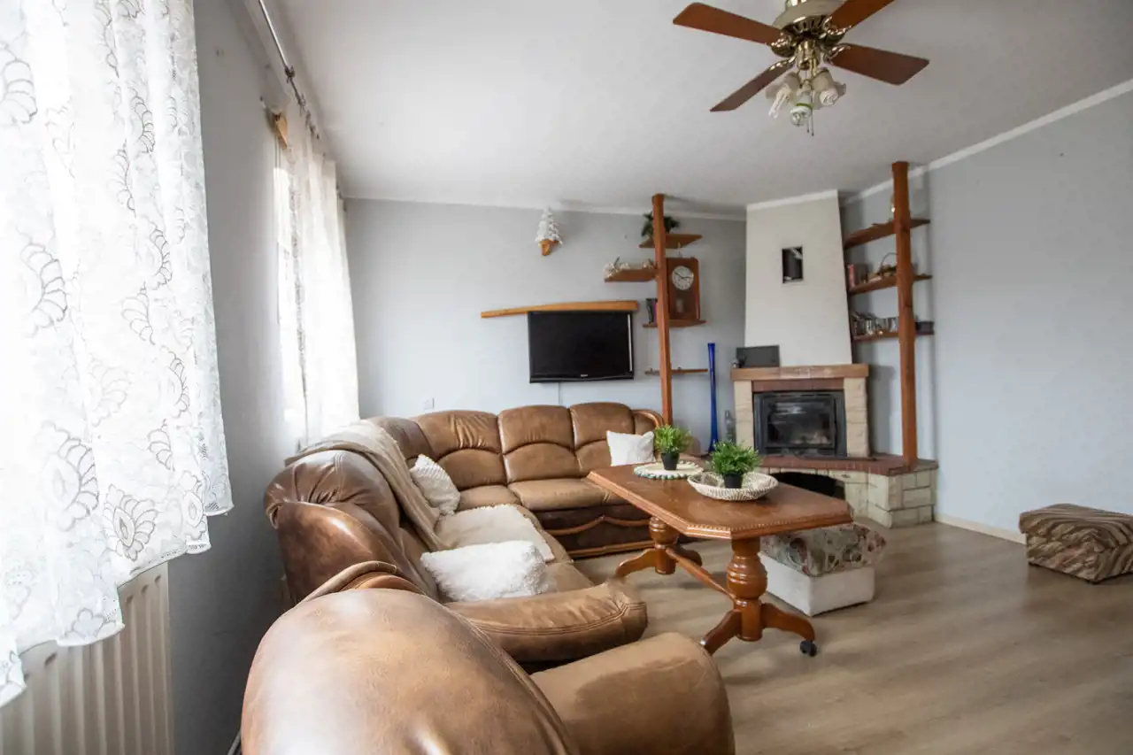- Salon: Kanapa narożna, fotel, komoda, stolik kawowy