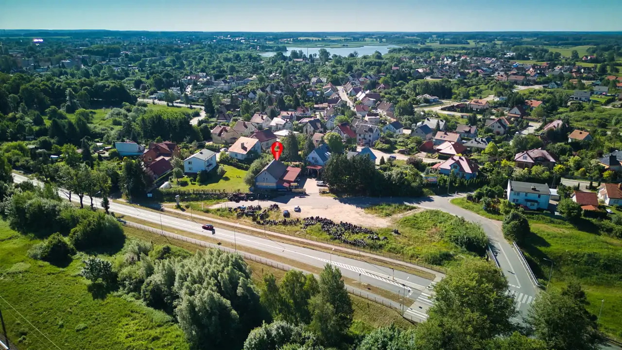 Działka jest w pełni ogrodzona, a od frontu zamontowana jest szeroka przesuwna brama wjazdowa otwierana ręcznie. Cały plac został utwardzony kostką. Dodatkowo poza budynkiem zbudowane zostały 2 duże wiaty, które powiązane są z budynkiem. Jedna przy której znajdują się 3 stanowiska do obsługi aut ma ponad 100 m2. Druga wiata ma powierzchnię ok 36 m2. Budynek podpięty do sieci trójfazowej (zabezpieczenie aktualne to 20 kW), sieci wodociągowej oraz kanalizacyjnej. W ulicy równoległej znajduje się sieć gazowa. Wjazd na działkę bezpośrednio z drogi gminnej.