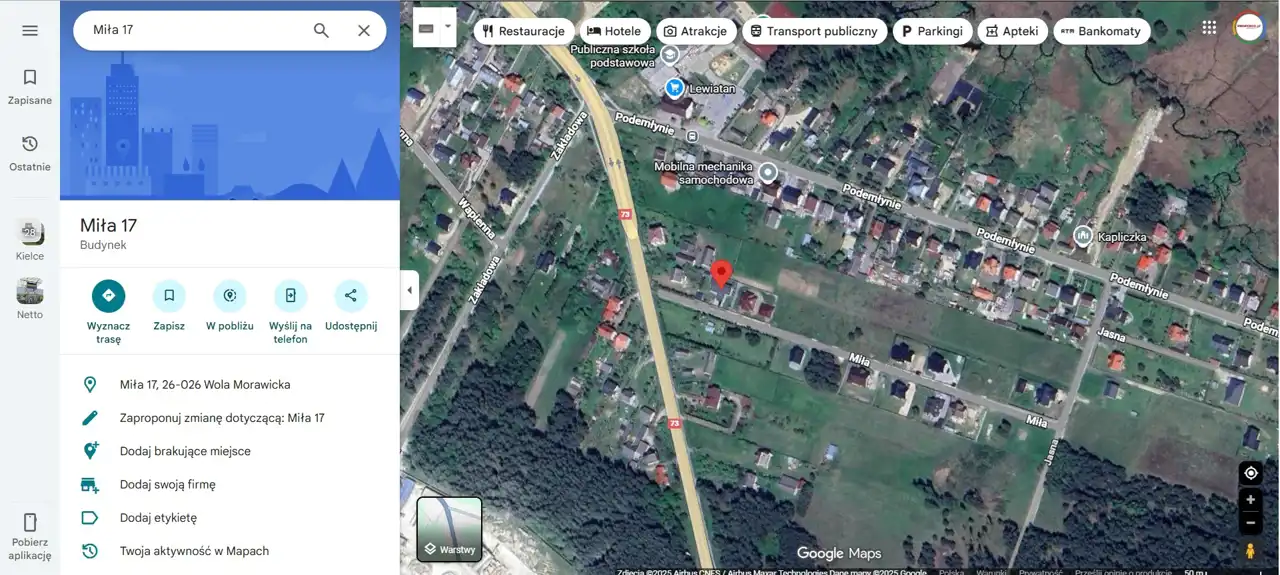 The property is located in a very good location, with convenient connections to Kielce (city and suburban buses). In the vicinity there is single-family housing, a primary school, a kindergarten, shops, and the Morawica Reservoir.