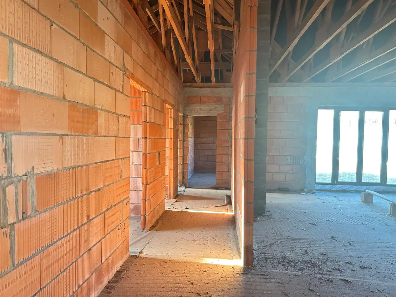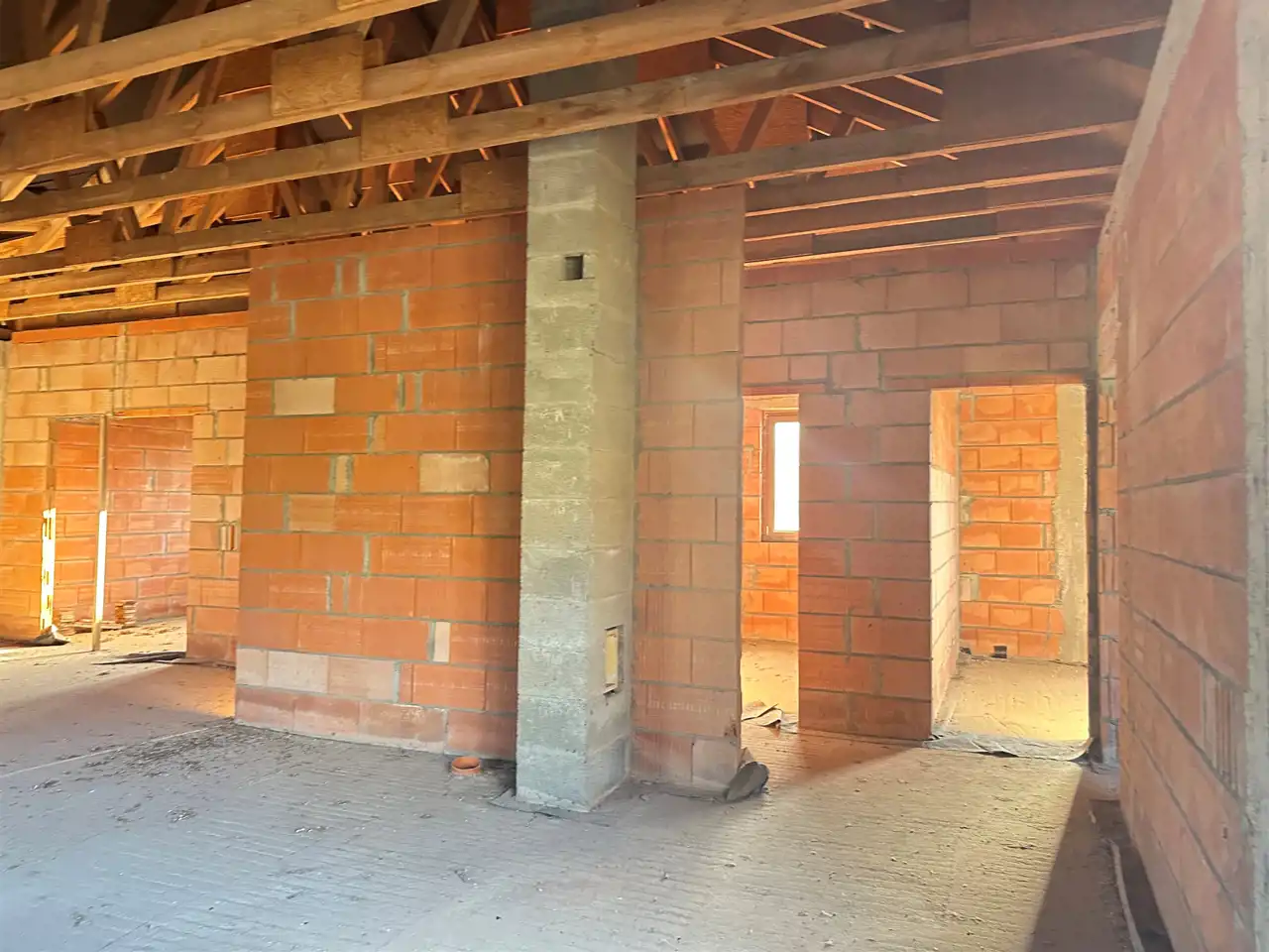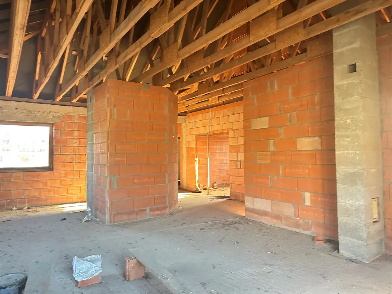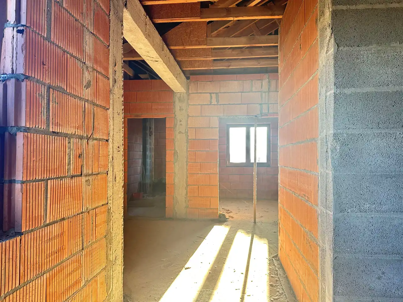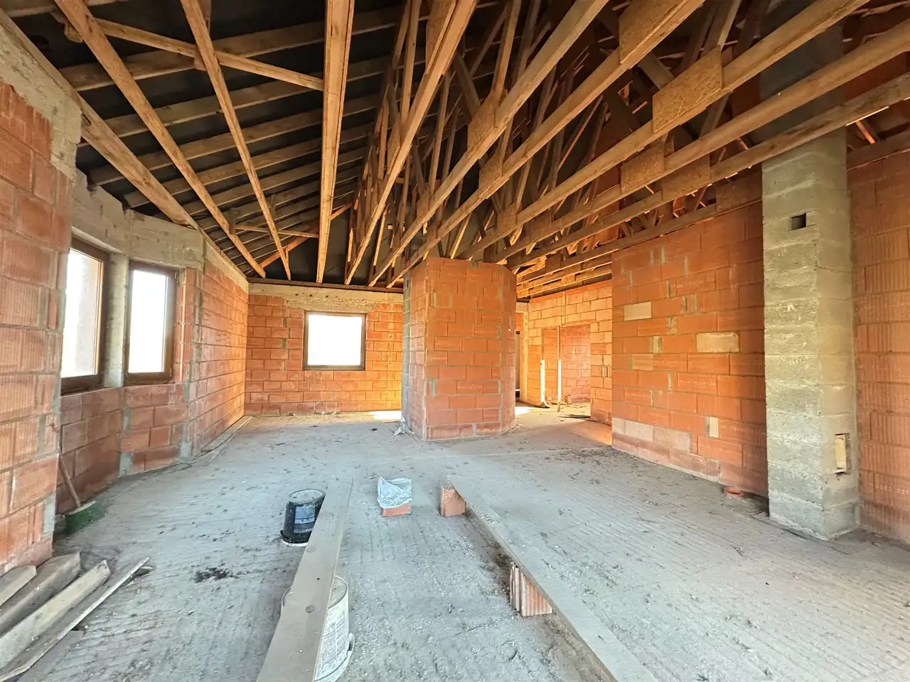 Dom został wybudowany w technologii murowanej, z dbałością o solidność konstrukcji. Budynek jest ocieplony, otynkowany z zewnątrz (struktura) i przygotowany do dalszych prac wykończeniowych według własnych potrzeb. Stan surowy zamknięty obejmuje m.in. wstawione okna oraz pokrycie dachu, stan surowy zamknięty.