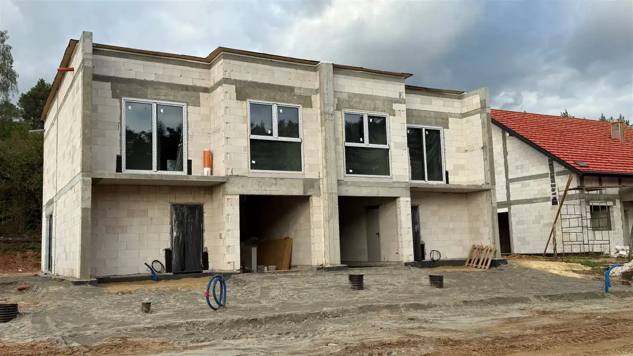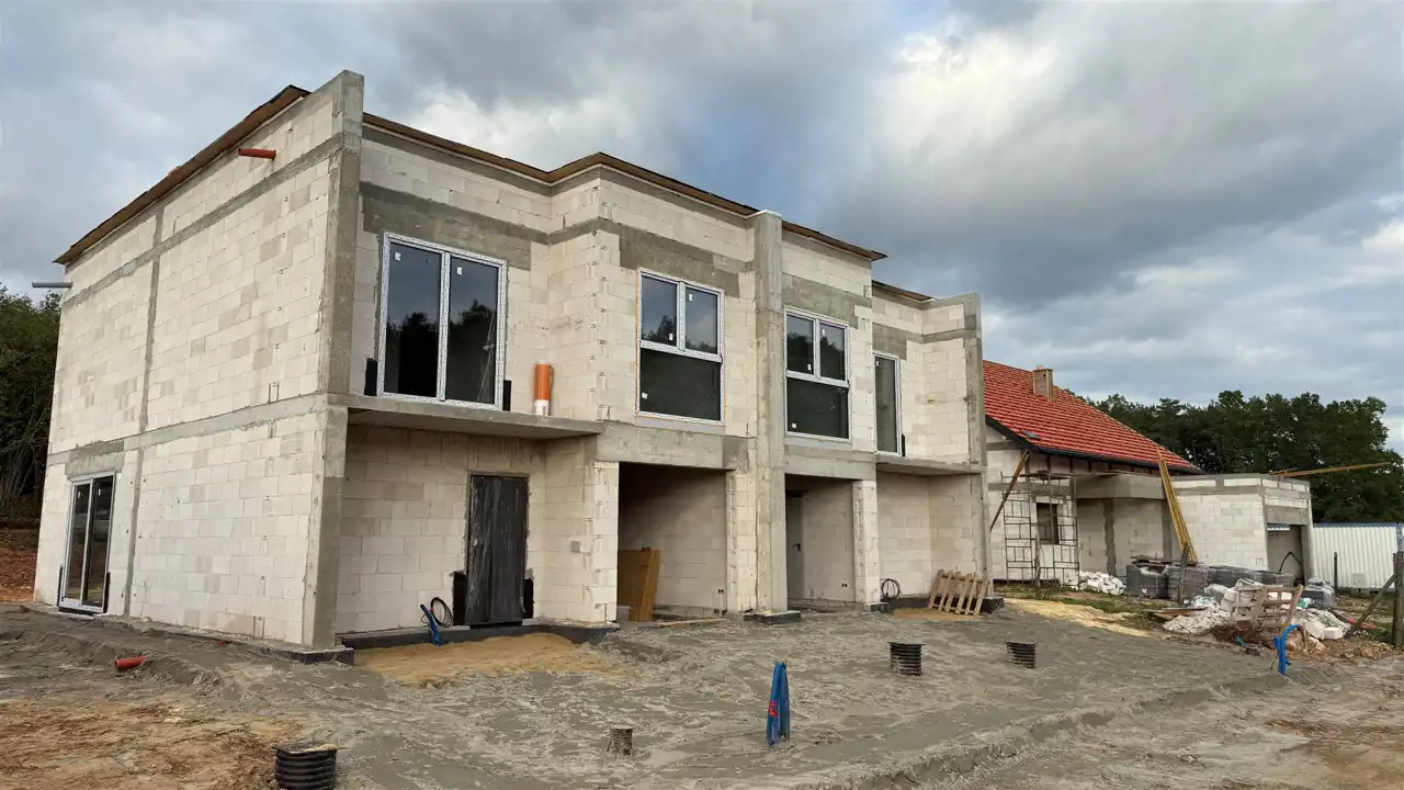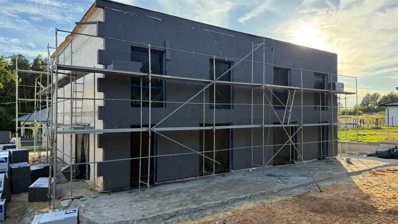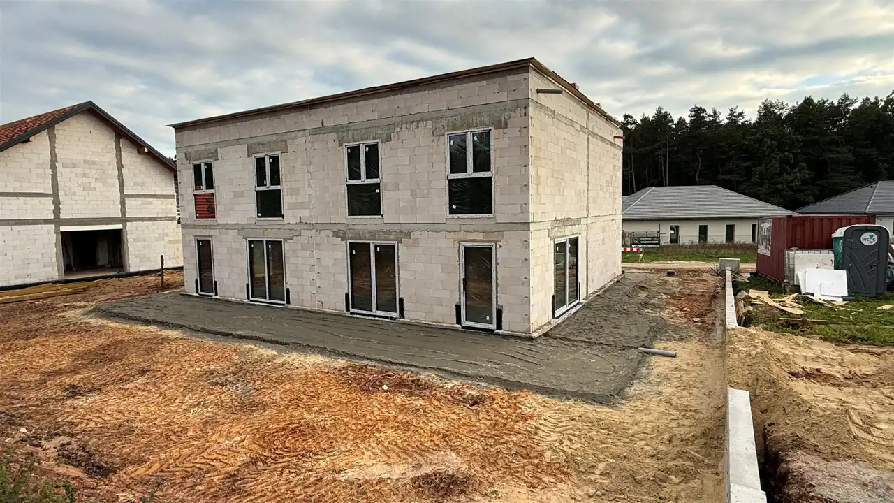 The house is in developer standard and the area around the building will be landscaped. It will be built from sand-lime blocks, insulated with 20 cm thick styrofoam, with planned heating via a heat pump. The roof is flat with full thermal insulation.