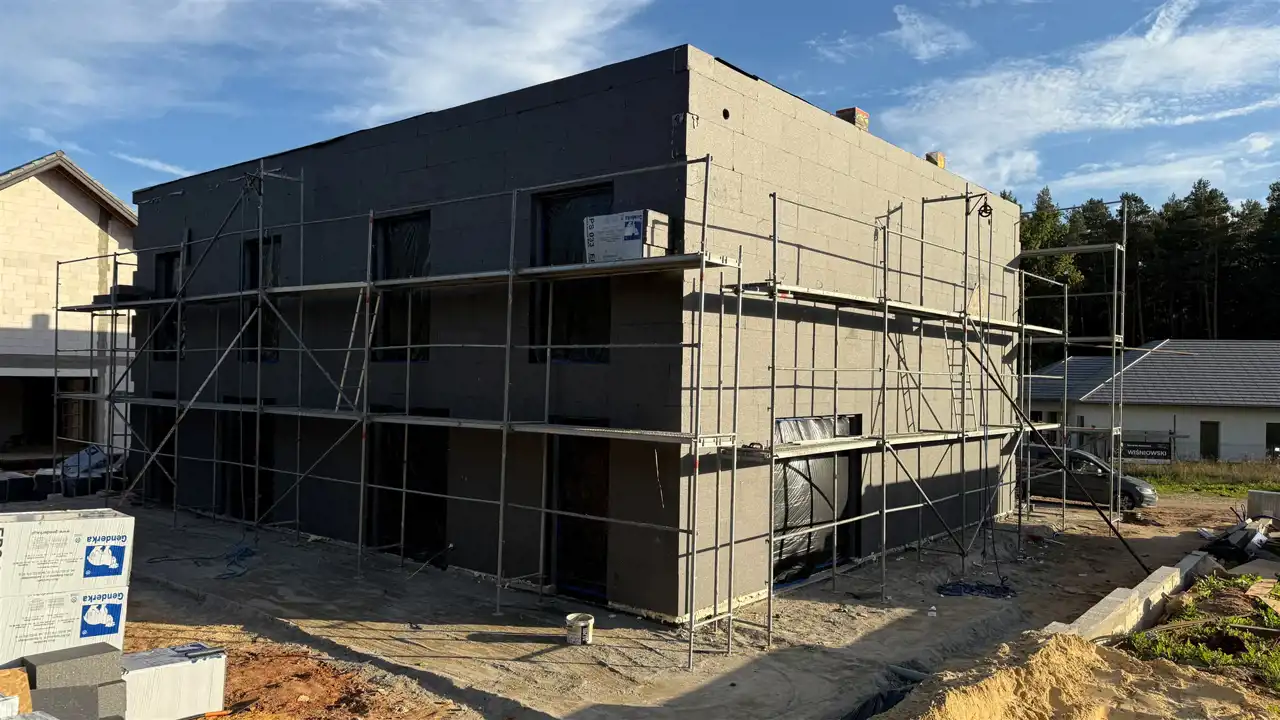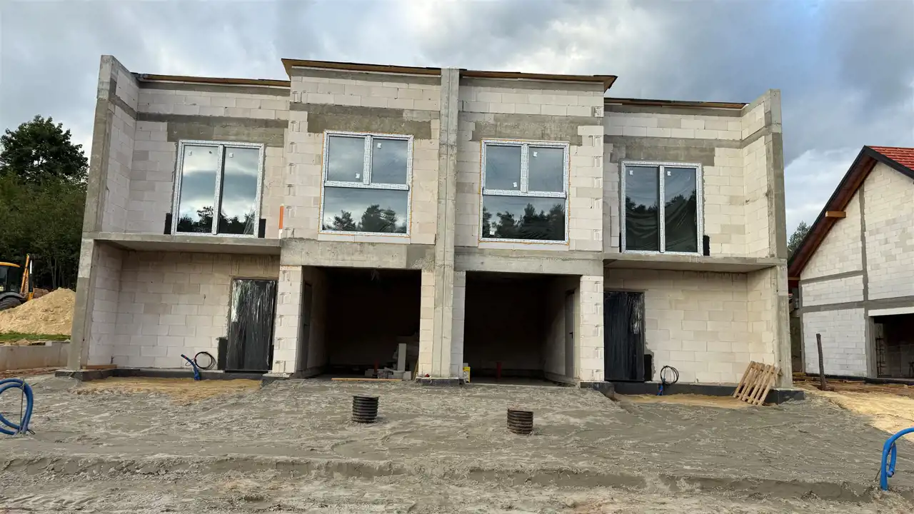 Dom stanie deweloperskim, teren przy budynku zostanie zagospodarowany. Budynek zostanie wybudowany z bloczka wapienno-piaskowego, ocieplony styropianem o grubości 20cm, planowane ogrzewanie pompą ciepła. Dach płaski z pełną izolacją termiczną.