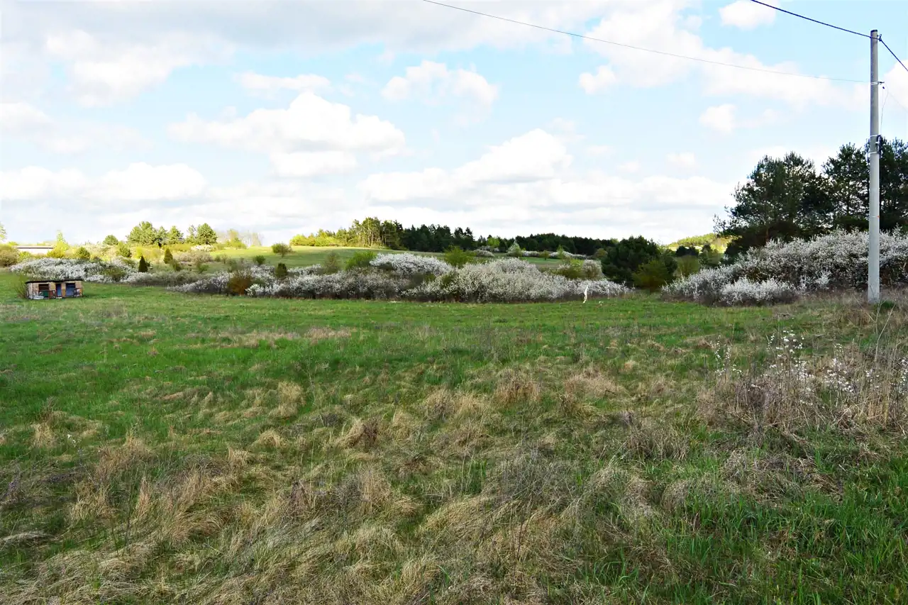 The plot is in the first line, with direct access via a municipal gravel road. In the vicinity, there are undeveloped plots and new houses. The plot is slightly sloped, rectangular in shape, undeveloped, unfenced, and surrounded by green areas.