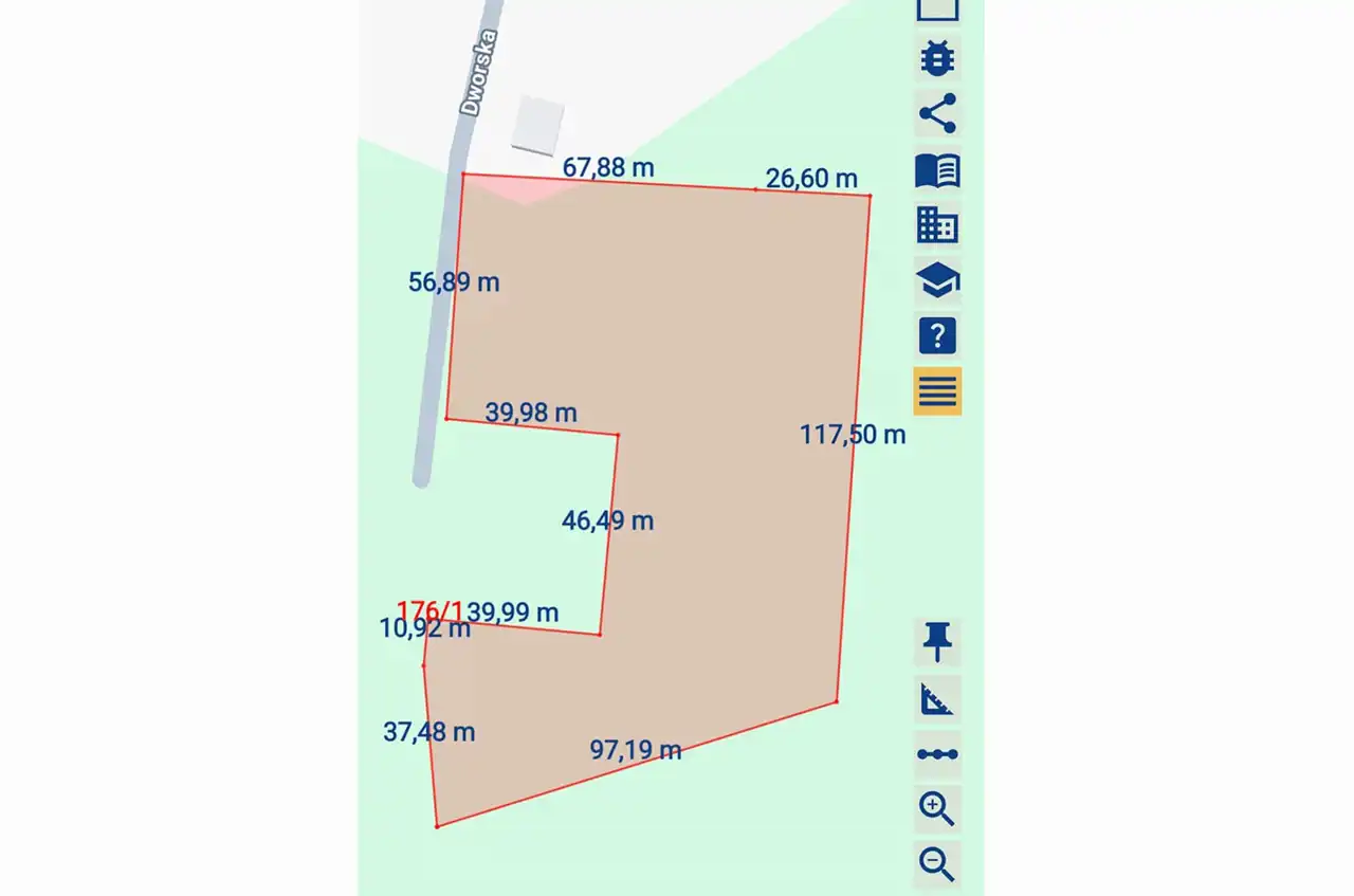 Wymiary działki (w przybliżeniu): 56 x 94 x 117 x 97 x 48 x 39 x 46 x 3922,8 x 399 x 28,3 x 387 [m].