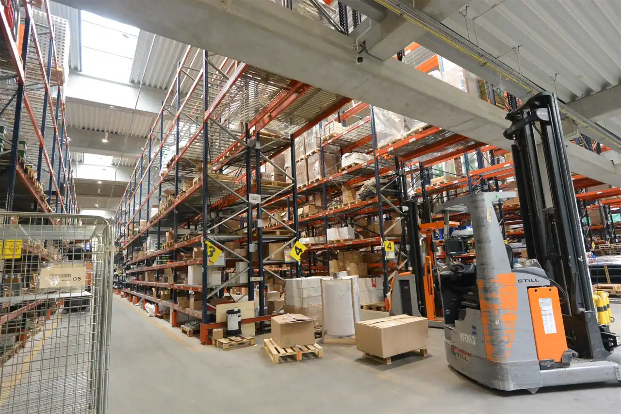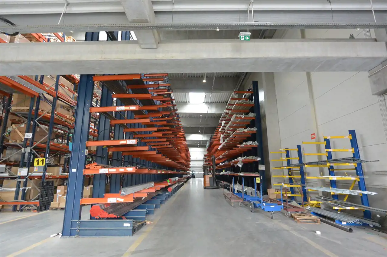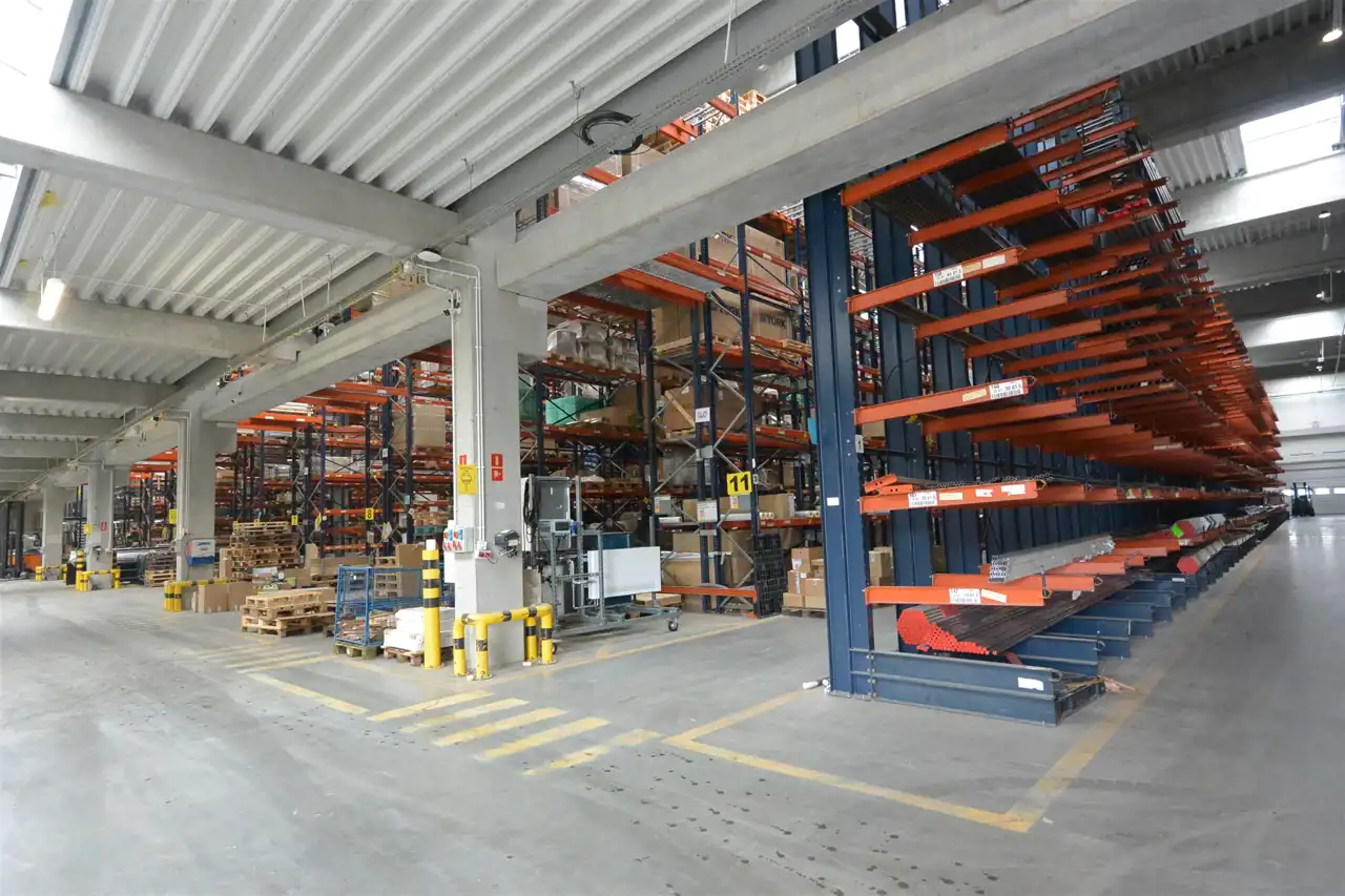 - high-bay warehouse with pallet racking (8 m high, 9,000 pallet locations) and cantilever racks for pipes,